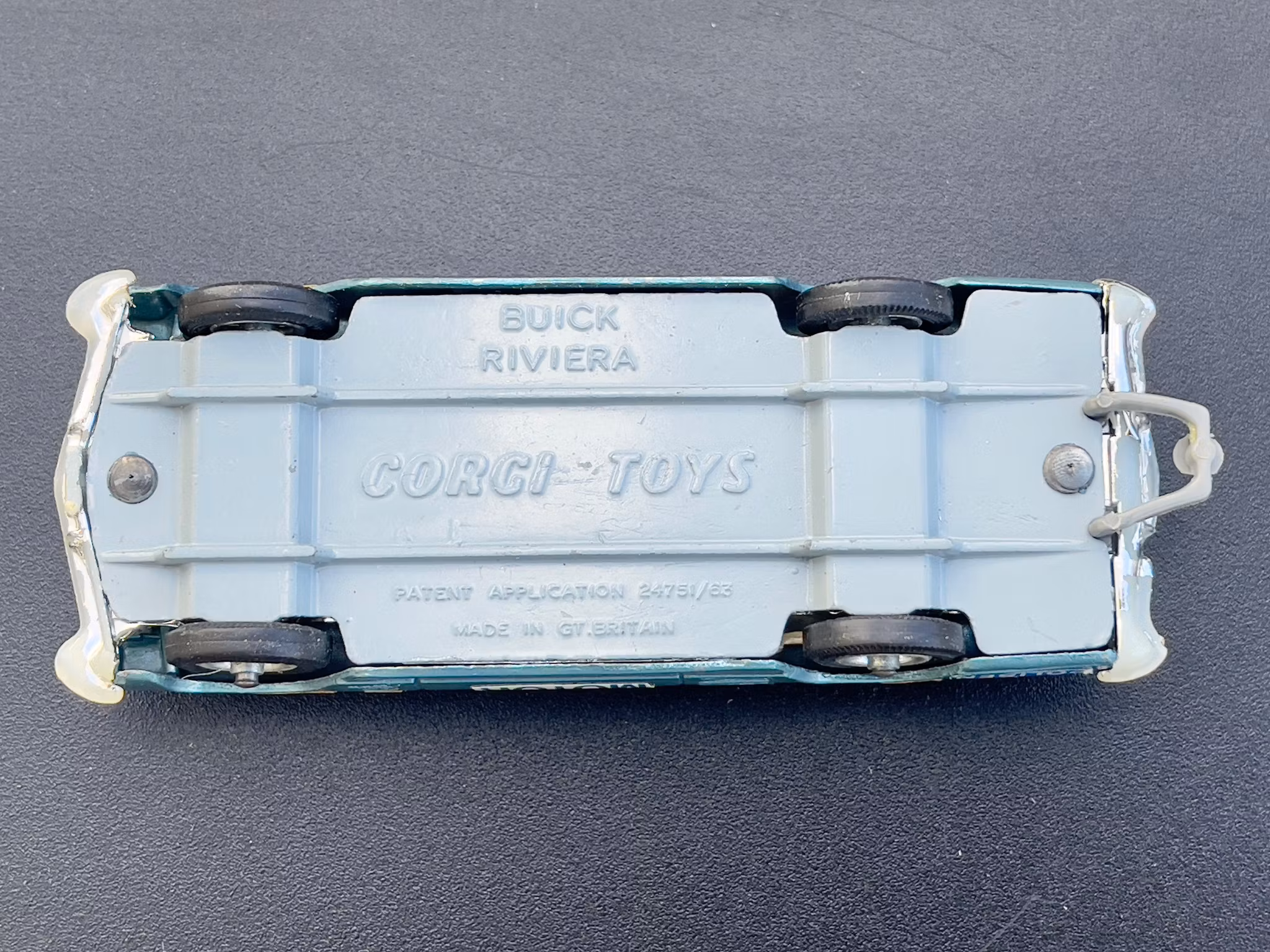 Corgi Toys, Buick Riviera, England 1963 med många klistermärke som Malmö, Lund, Trelleborg, Ystas...