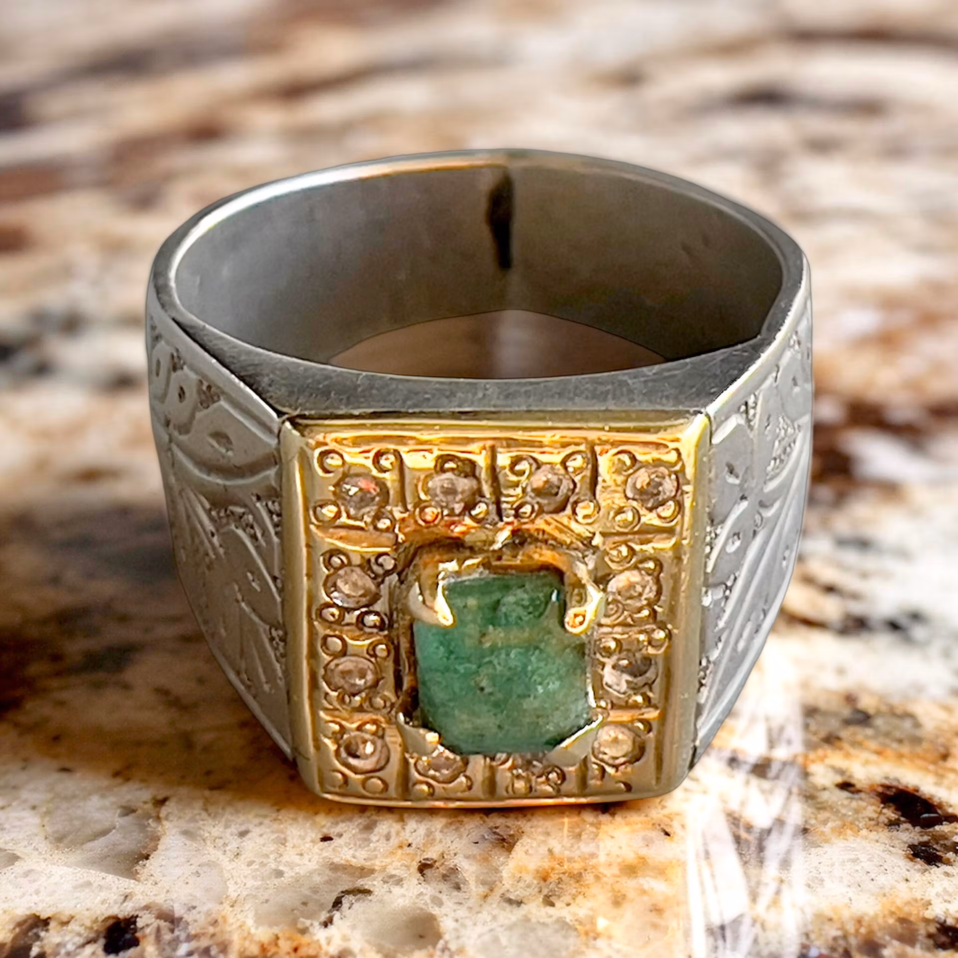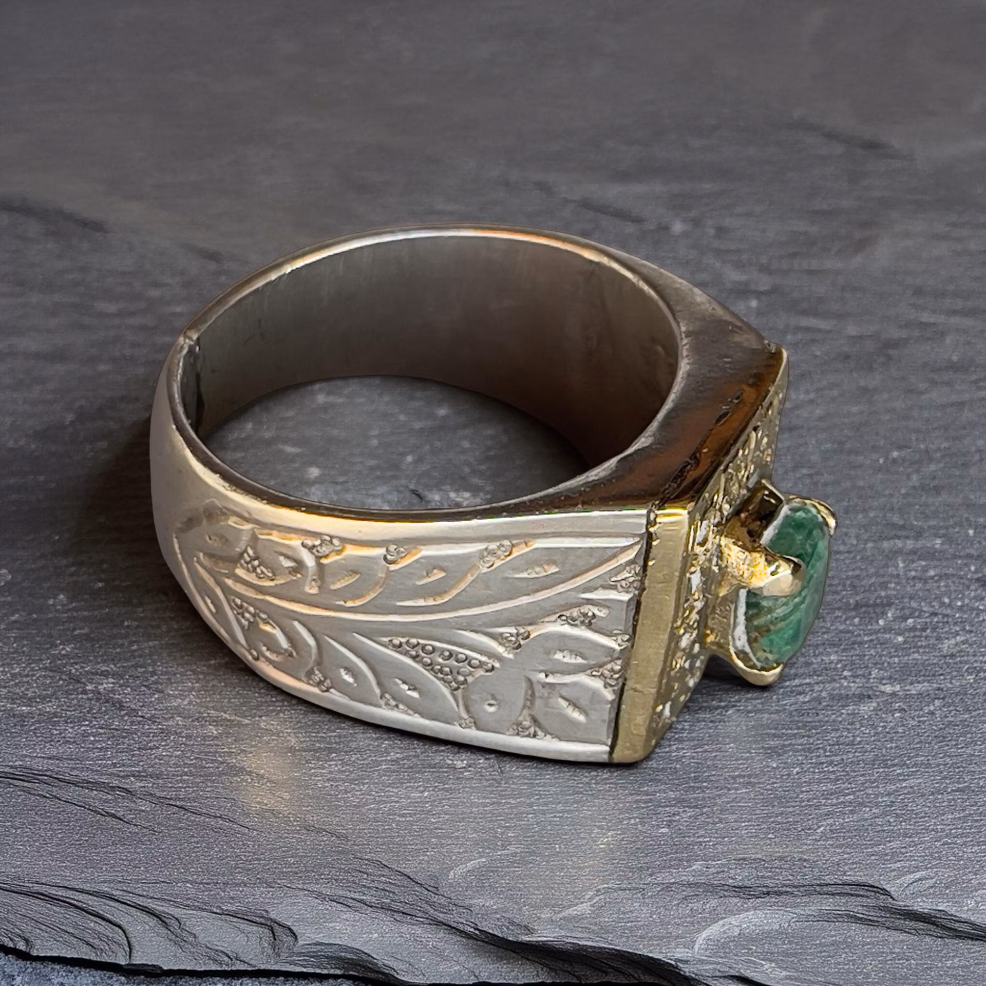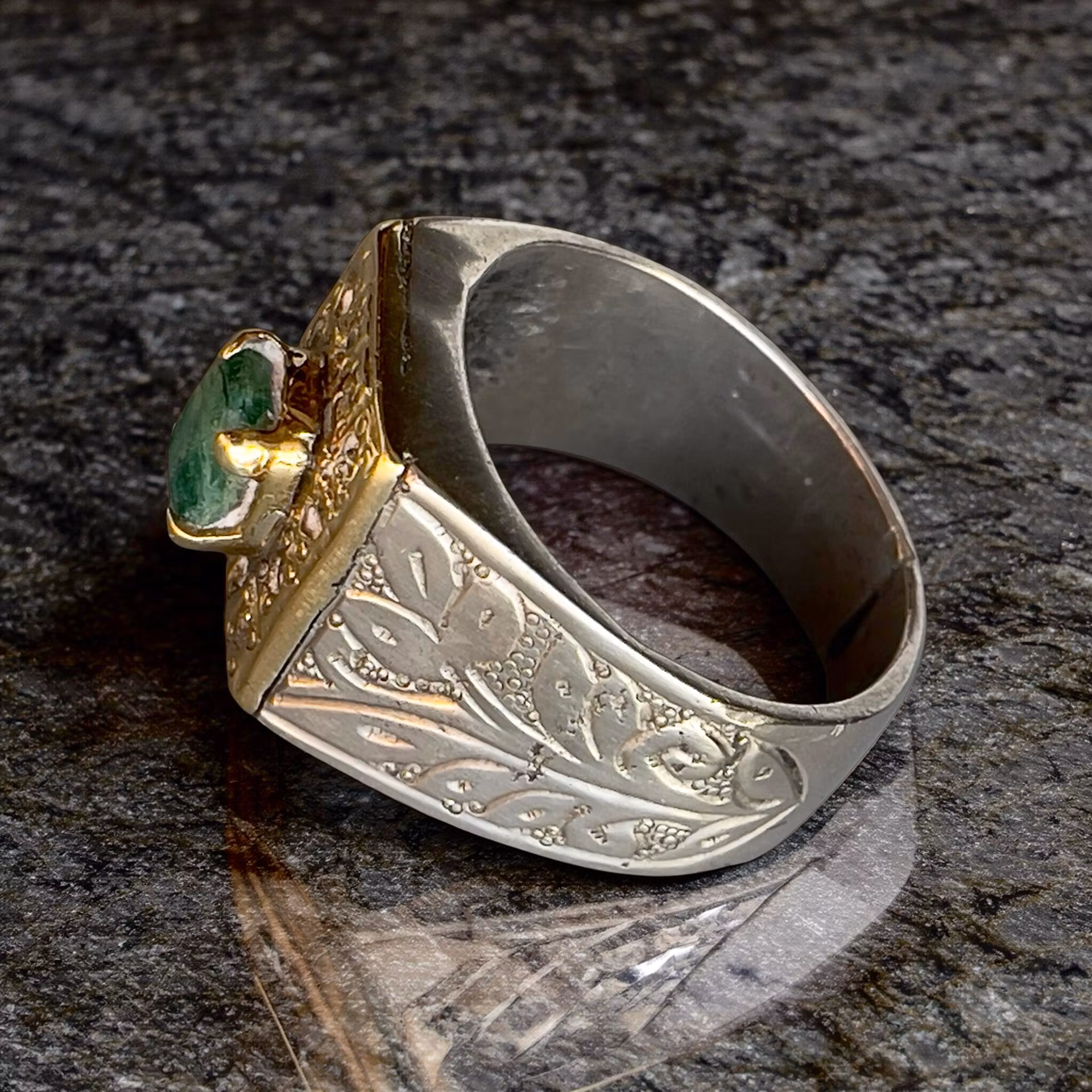 Elegant och kraftig ring i silver med en naturlig smaragd i centrum. Stenen är infattad i en dekorativ ram med guldfärgade detaljer. Ringen har vackert graverade mönster på sidorna och en bred, stabil skena som ger en exklusiv och gedigen känsla. Passar både till vardag och fest samt som en unik present.