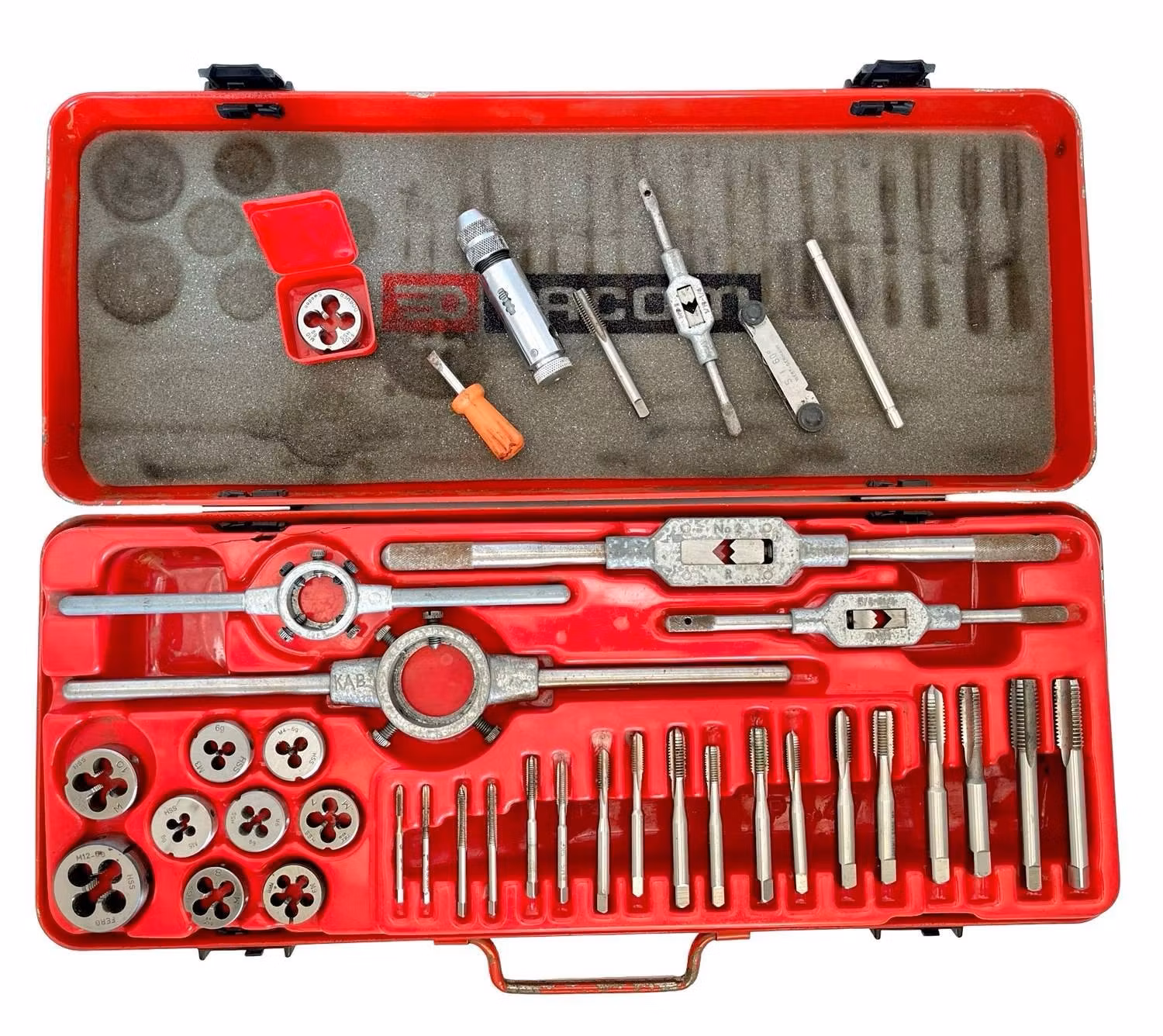 Säljer en äldre FACOM gängsats i original röd plåtlåda. Ett rejält och välgjort kvalitetsset med gängtappar, gängsnitt, hållare och tillbehör - Perfekt för verkstad, garage, renovering eller samling.