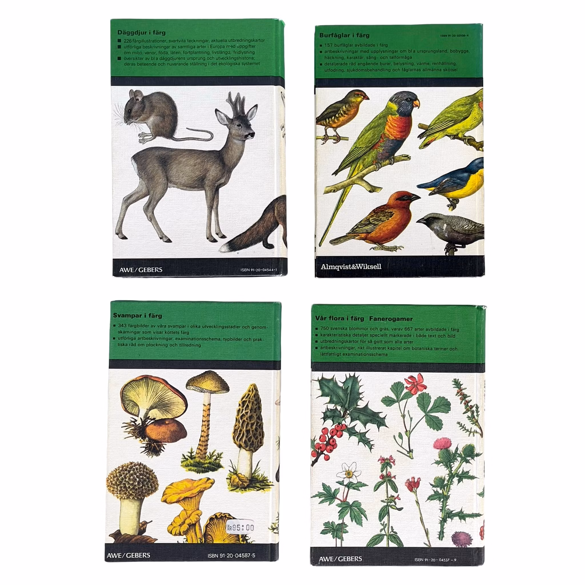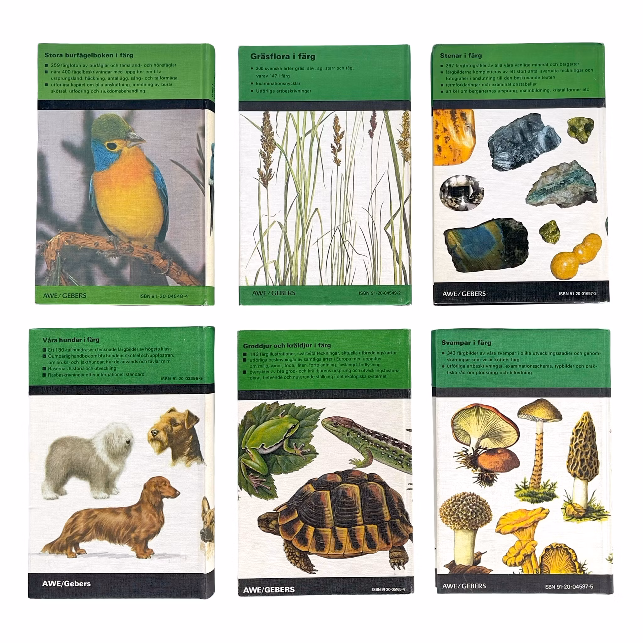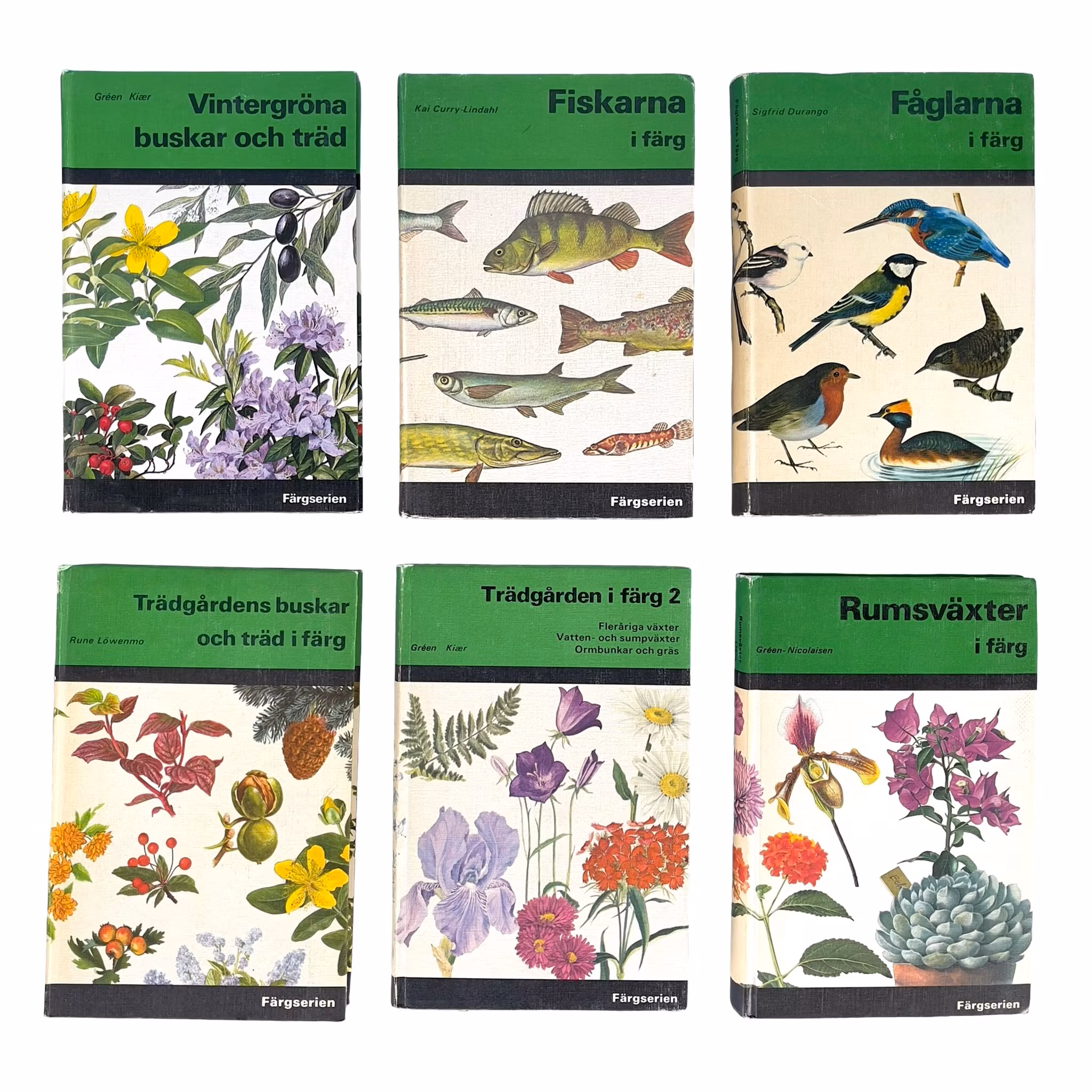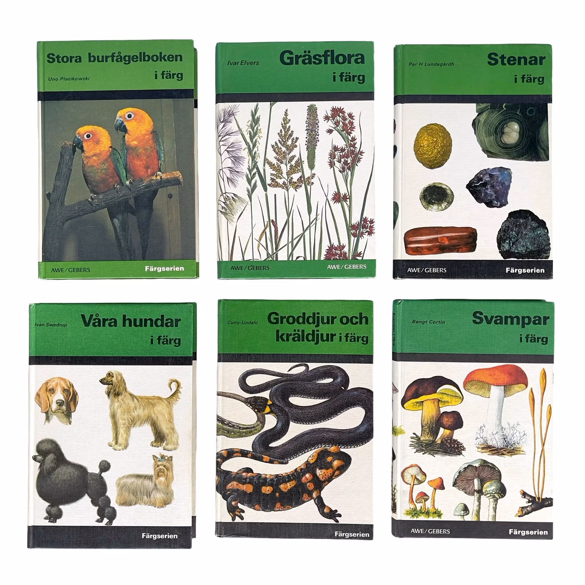 Ett omfattande parti om 30 inbundna böcker klassiska svenska naturböcker ur den populära serien "Färgserien" utgiven av AWE/Geber och Almqvist & Wiksell. Serien är välkänd för sina detaljerade färg illustrationer och pedagogiska texter. Böckerna behandlar flora, fauna, insekter, fåglar, fiskar, svampar, trädgård, hav, skog m.m.