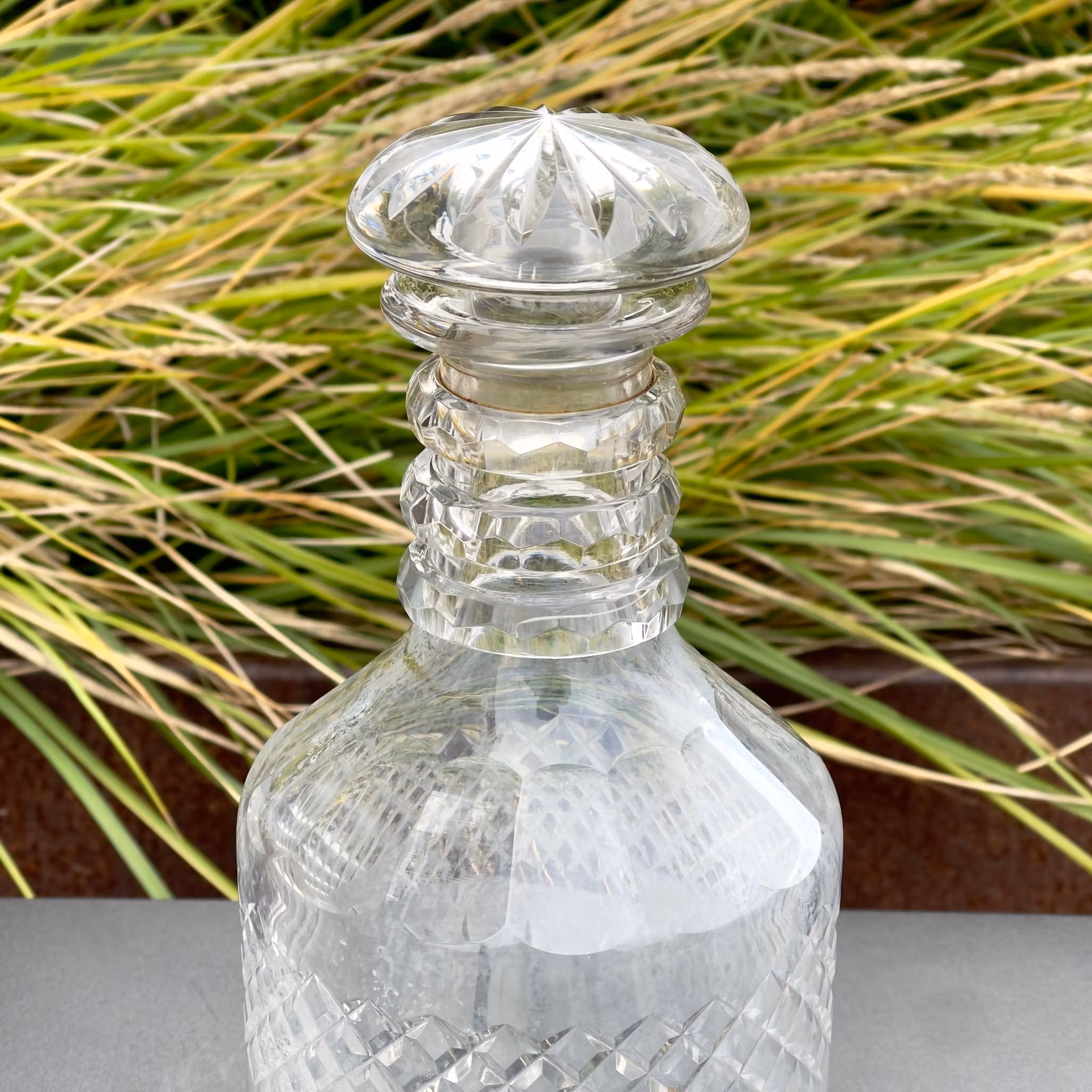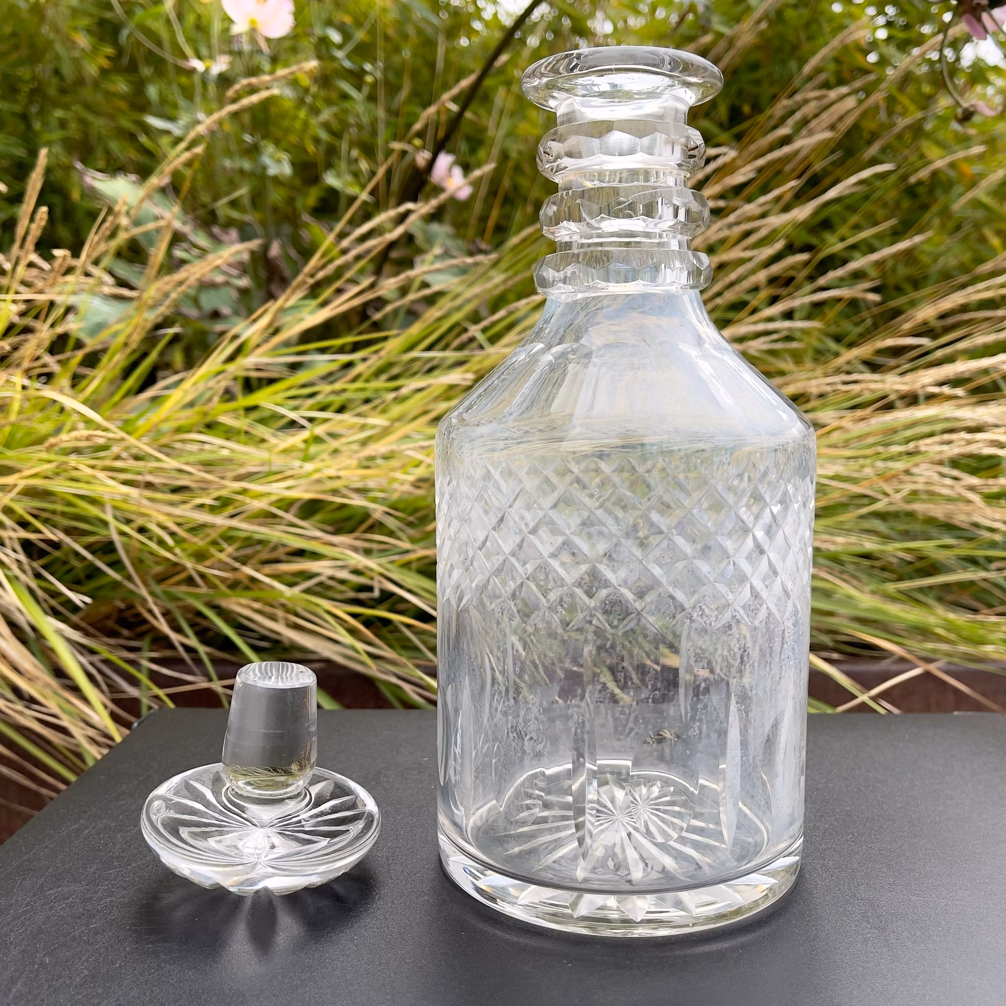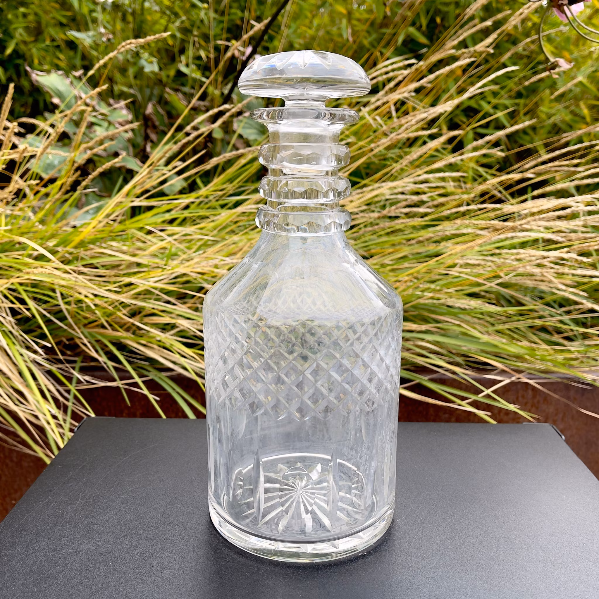 Tung, handblåst karaff med hjulslipad dekor: rutslipad midja, ovala slipfönster ovanför, stjärnslipad botten och profilerade halsringar. Svampformad propp med slipad kona som sitter bra.
