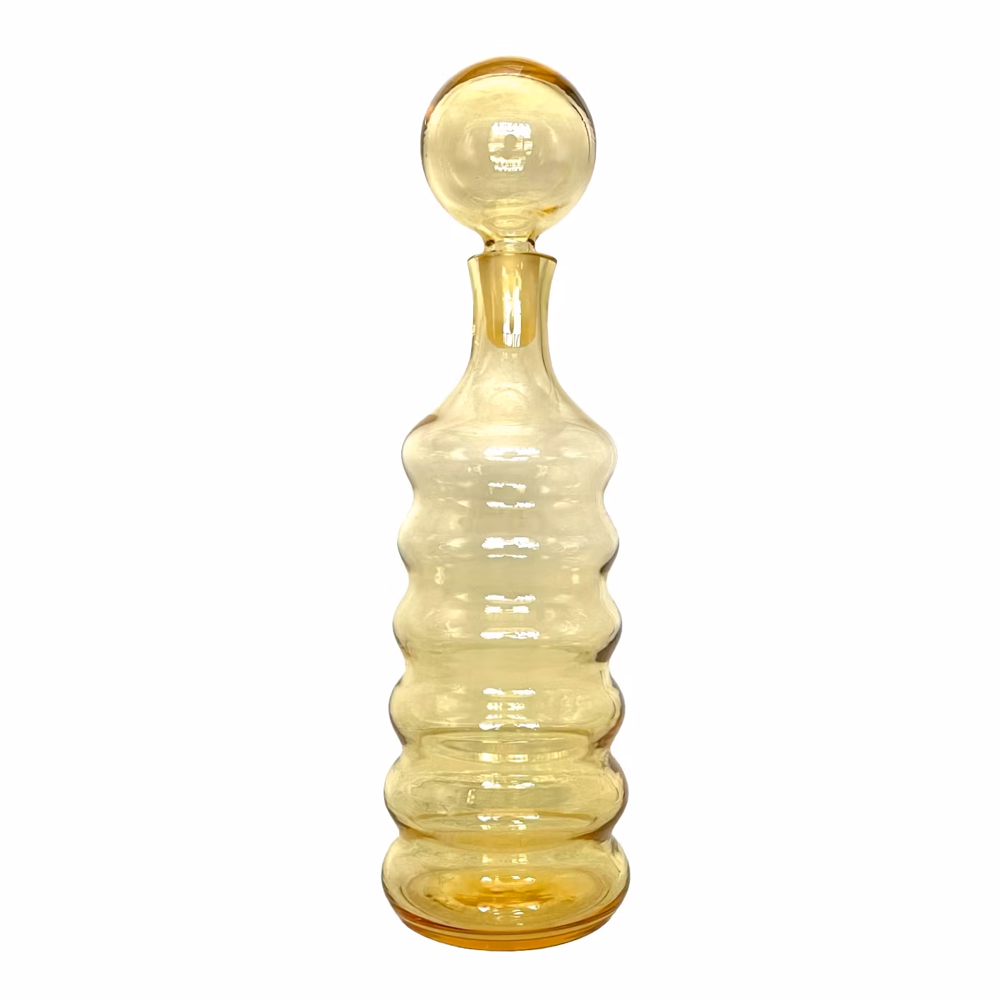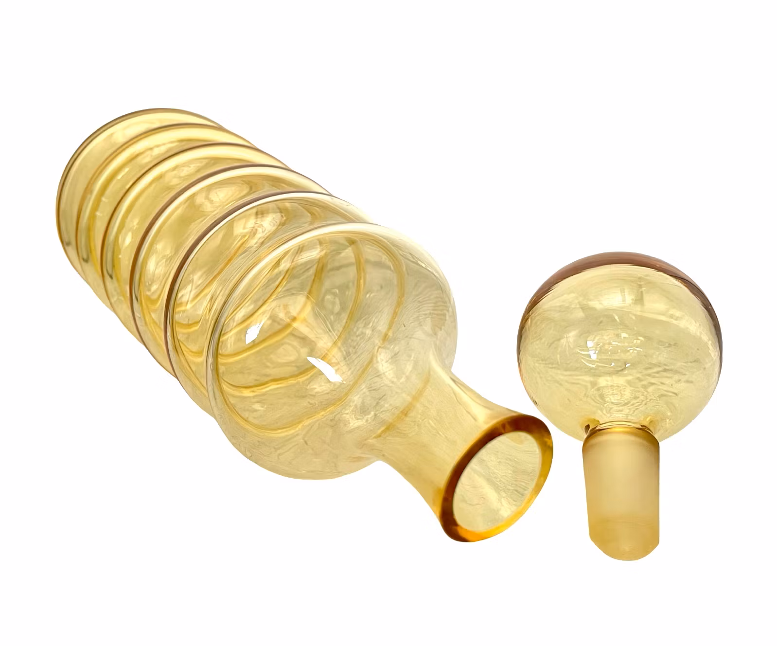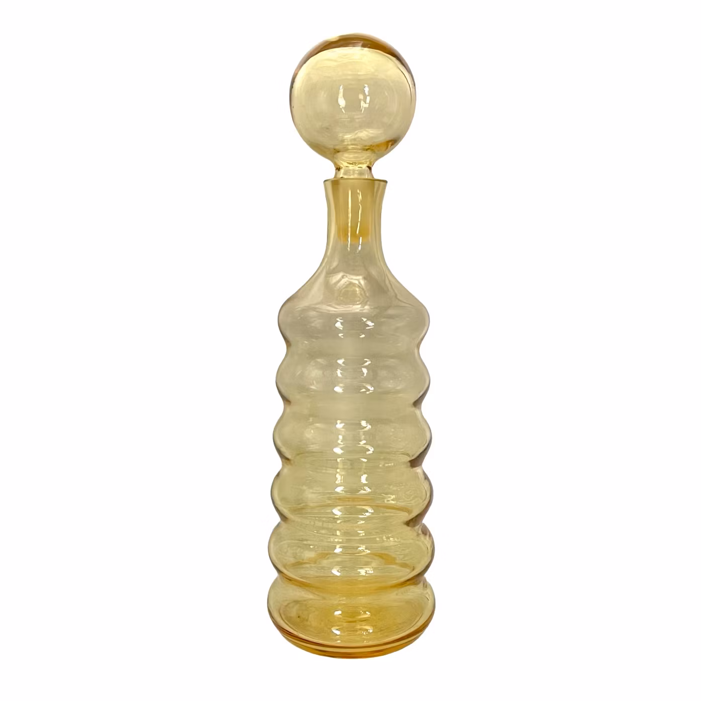 Handblåst dekanter i bärnstensfärgat glas från Älghults glasbruk. Klassisk svensk glasdesign med vågformad, räfflad kropp och rund glaspropp. Ett dekorativt och funktionellt samlarobjekt, perfekt för vin, whisky eller sprit.