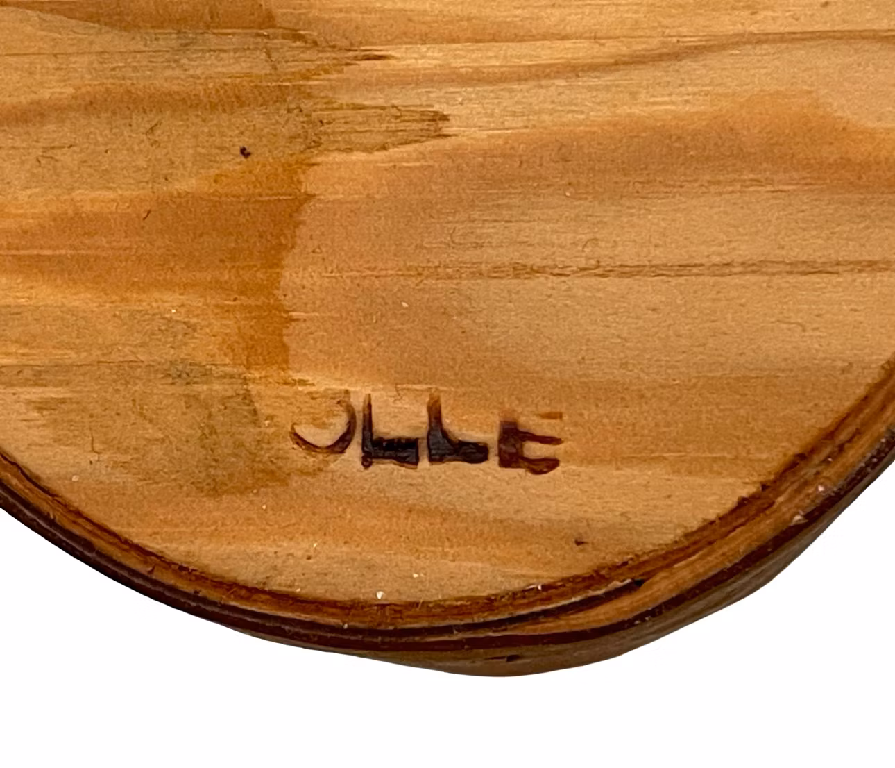 Lockets handtag består av en liten läderbit, och botten är signerad "Olle".