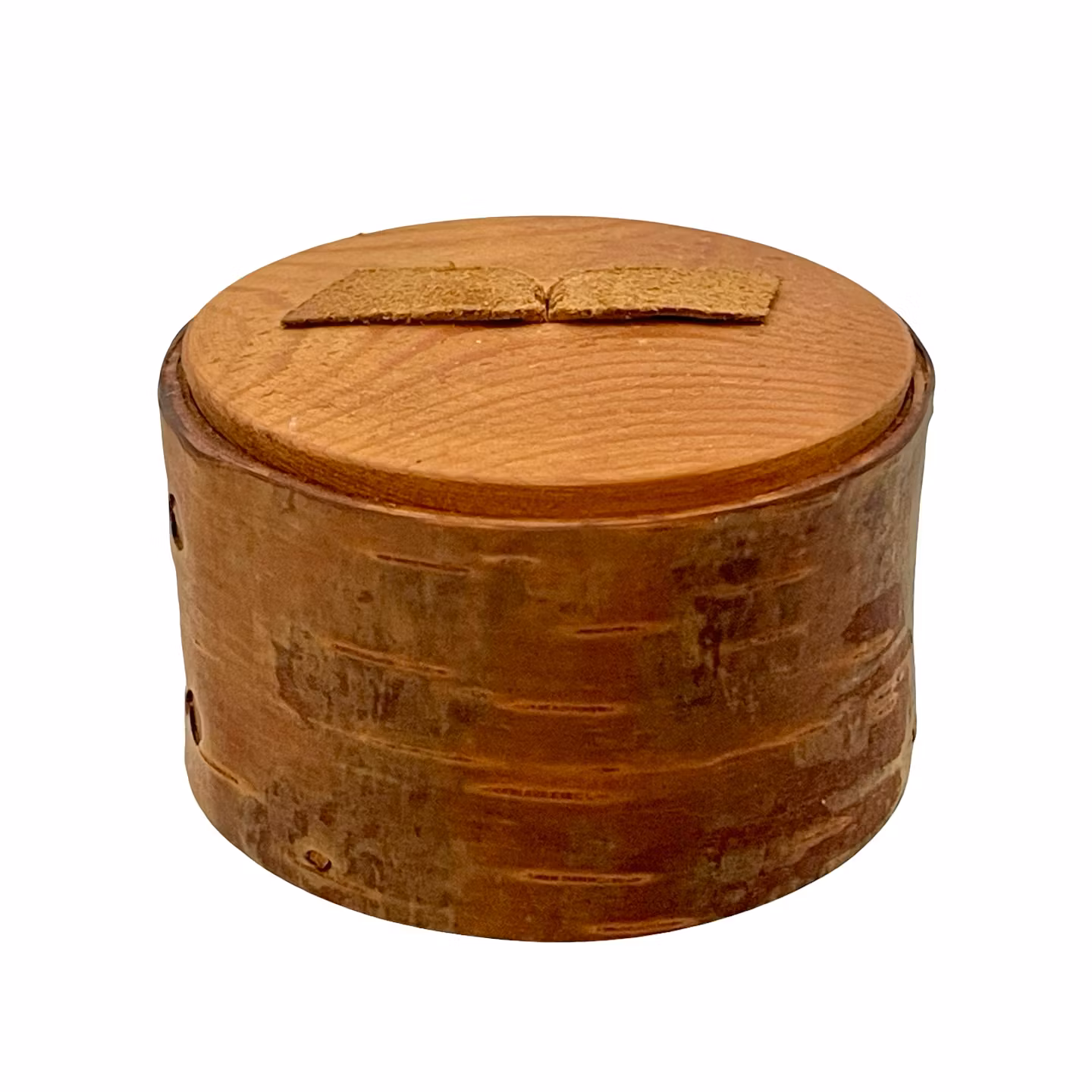 Charmig liten handgjord ask tillverkad i näver med träbotten och lock.