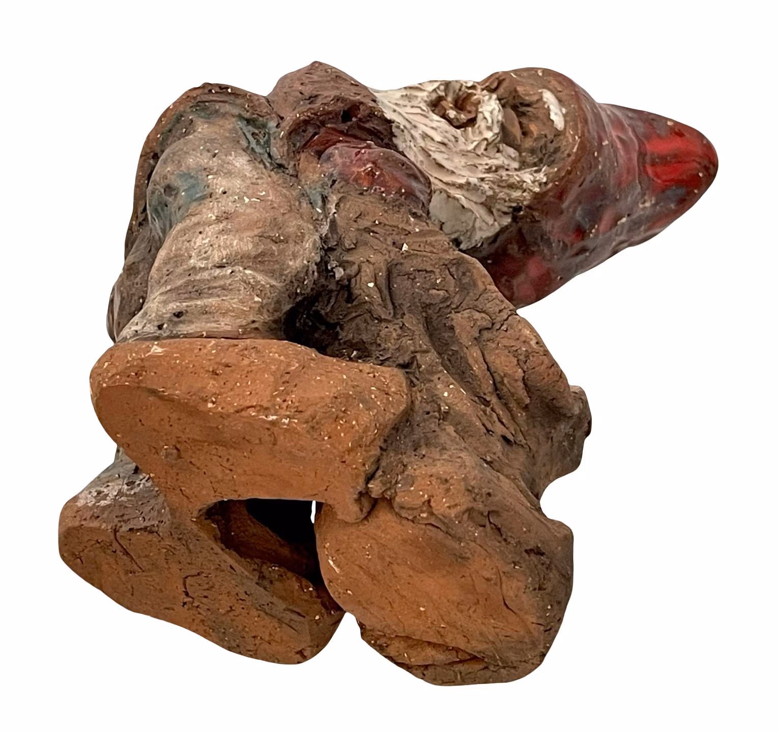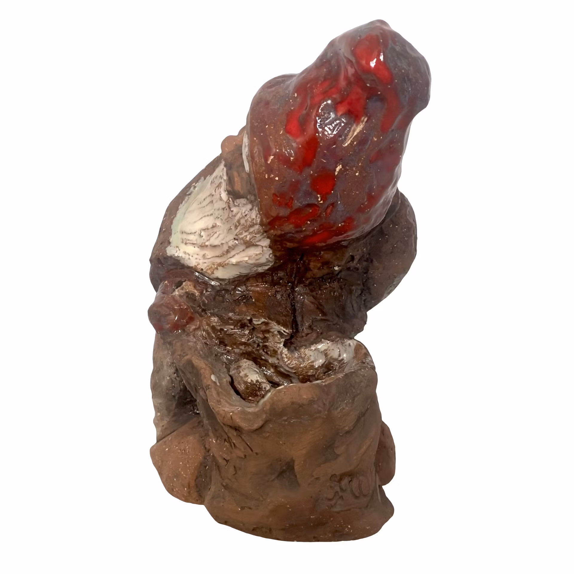 Unik handgjord tomte i rustik stil, tillverkad i keramik/lera. Figuren är konstnärligt modellerad med tydlig struktur och levande uttryck. Den röda glaserade luvan har en vacker glans som kontrasterar mot den matta, naturliga leran. Ett charmigt hantverk som passar som juldekoration eller samlarobjekt.