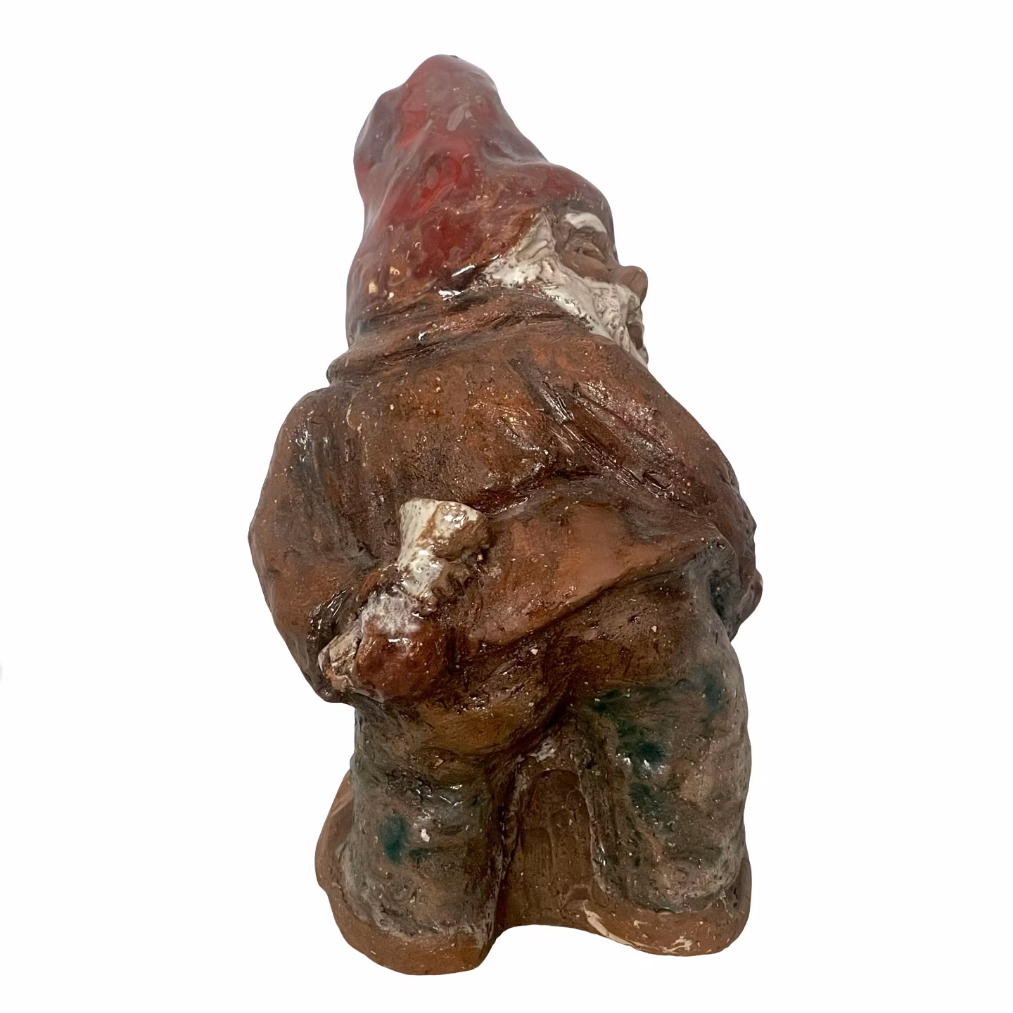 Handgjord tomte i lergods - Rustik konstnärlig skulptur med röd glaserad luva, Signerad
