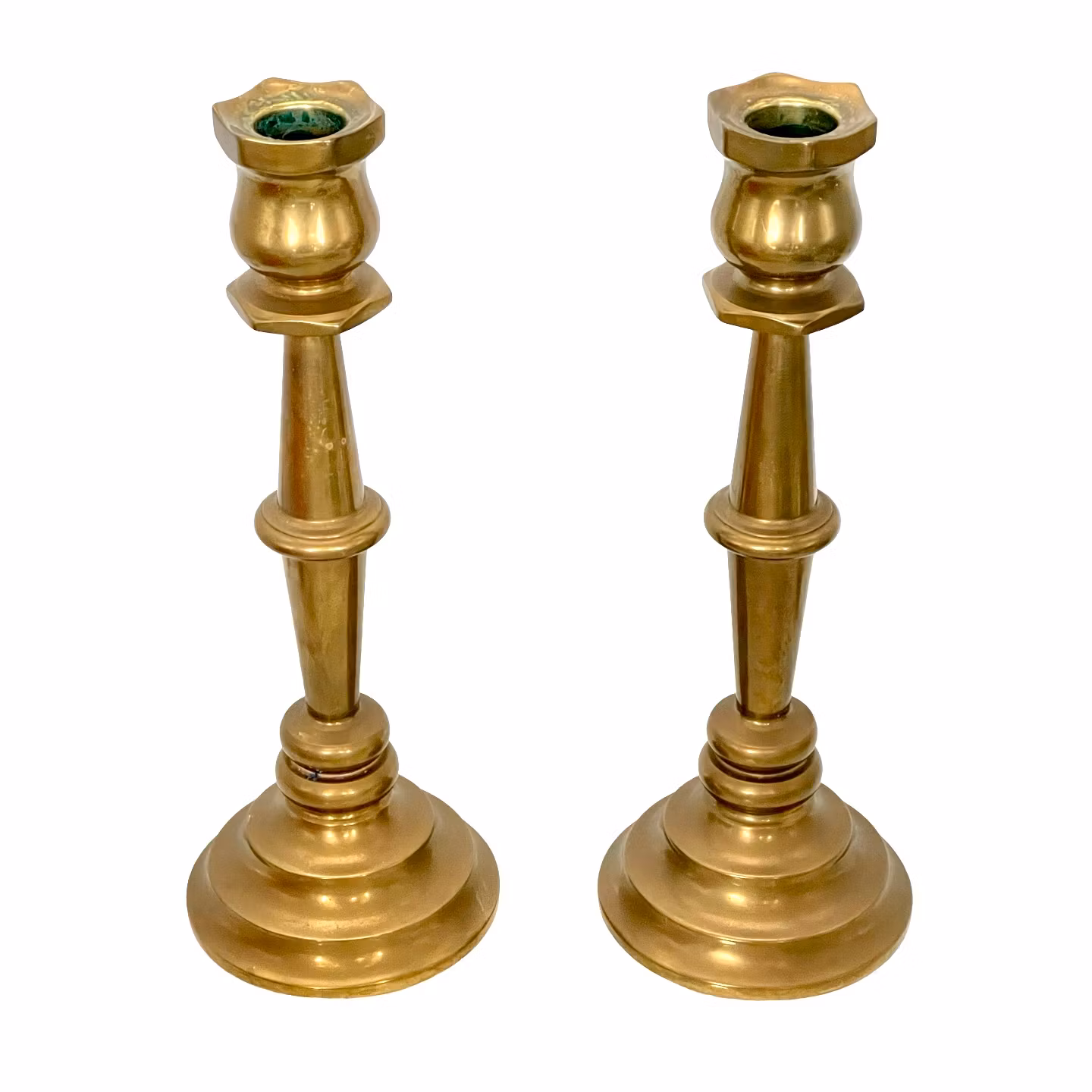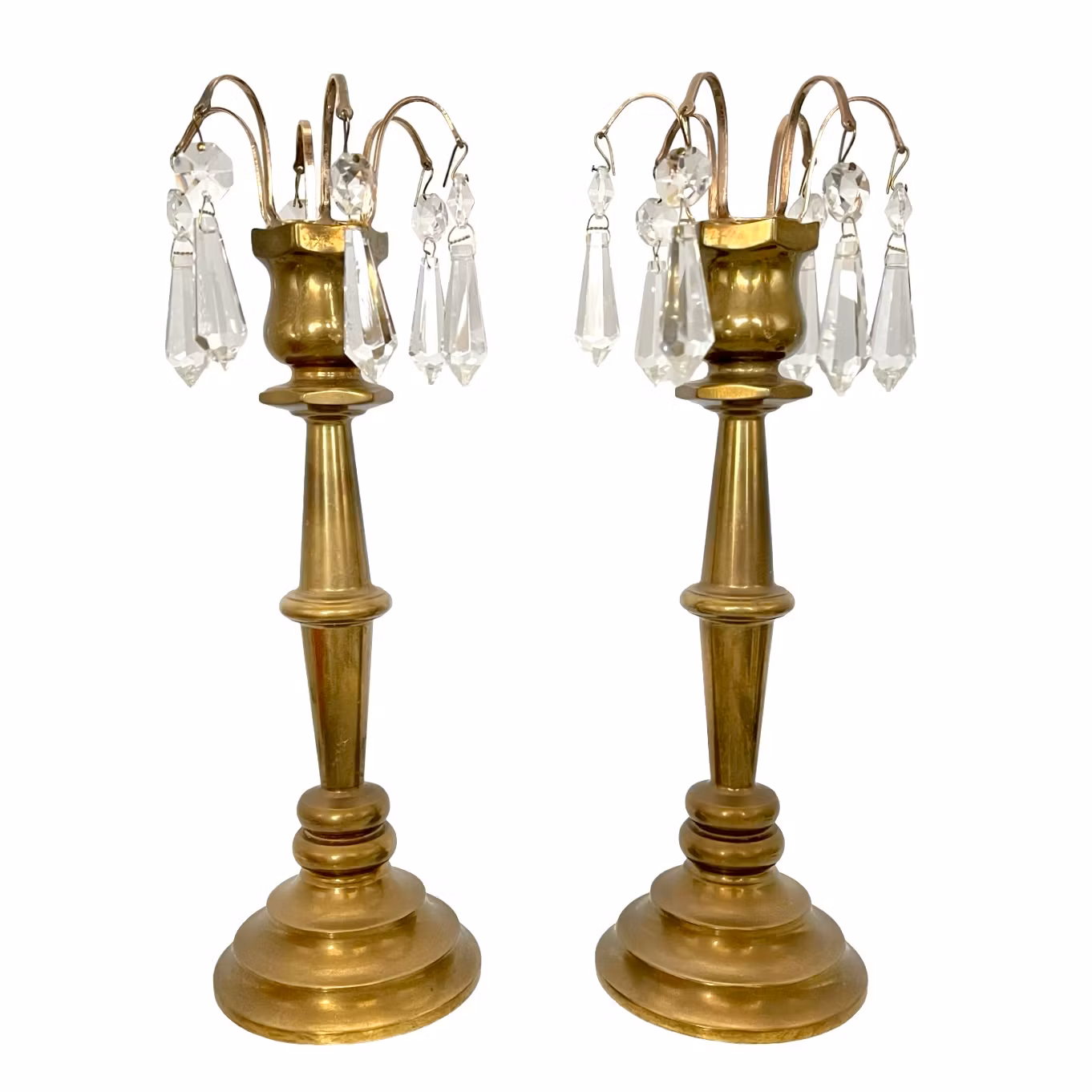 Elegant par ljusstakar i massiv mässing, designade av Alf Pålsson. Modellen har klassisk konisk fot och avtagbara mässingsringar med hängande glasprismor, vilket ger ett exklusivt och tidstypiskt uttryck. Ljusstakarna kan användas både med och utan prismorna.