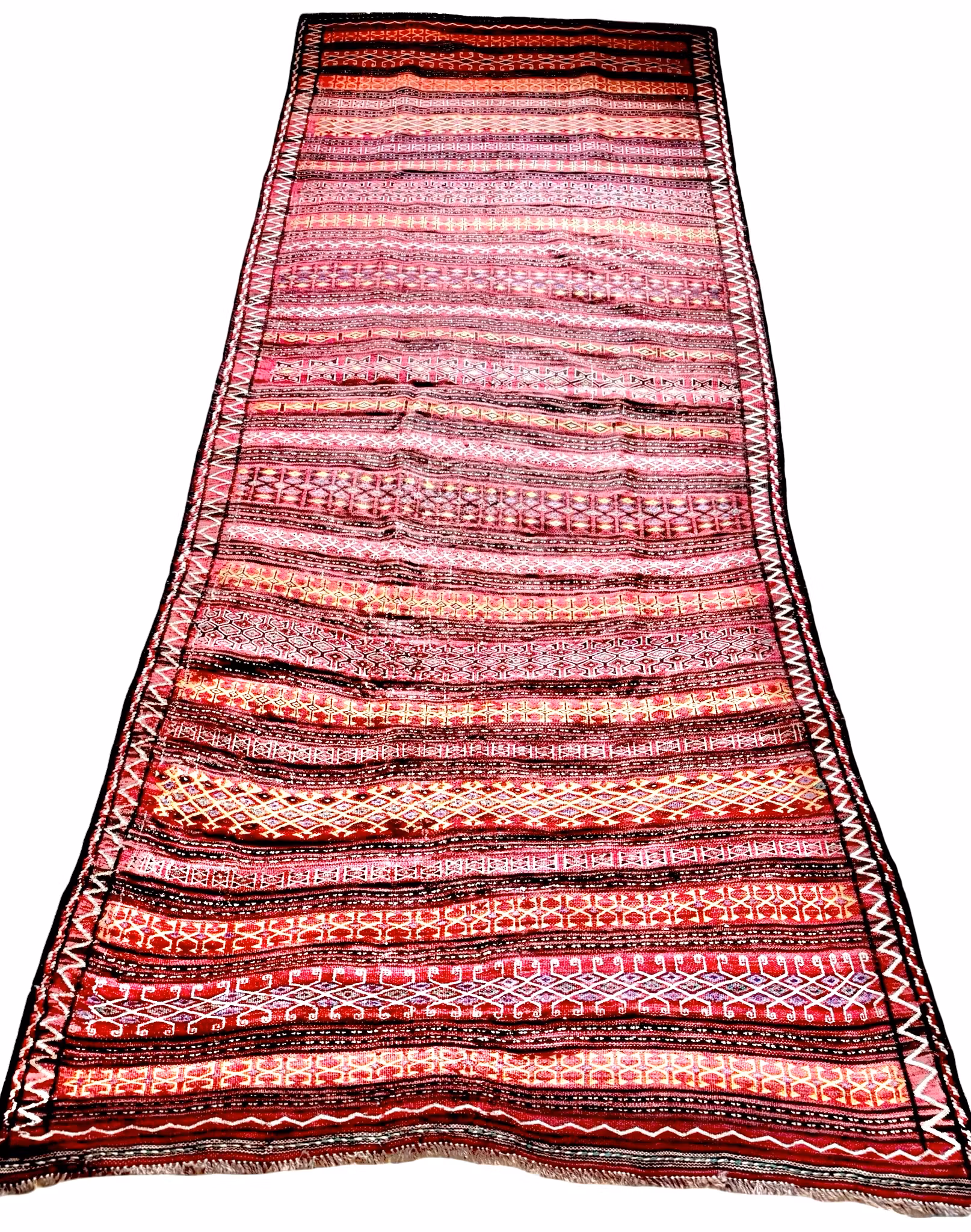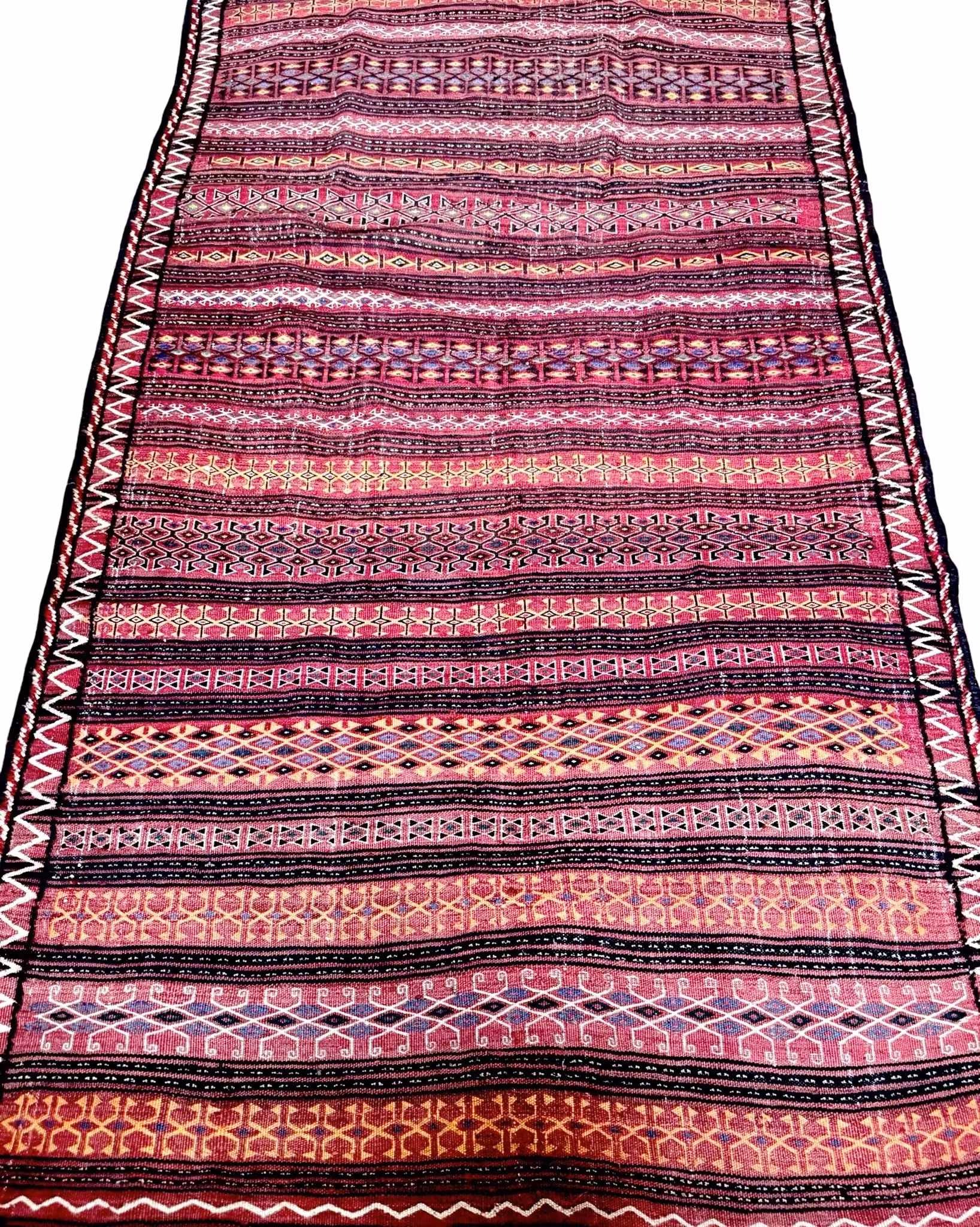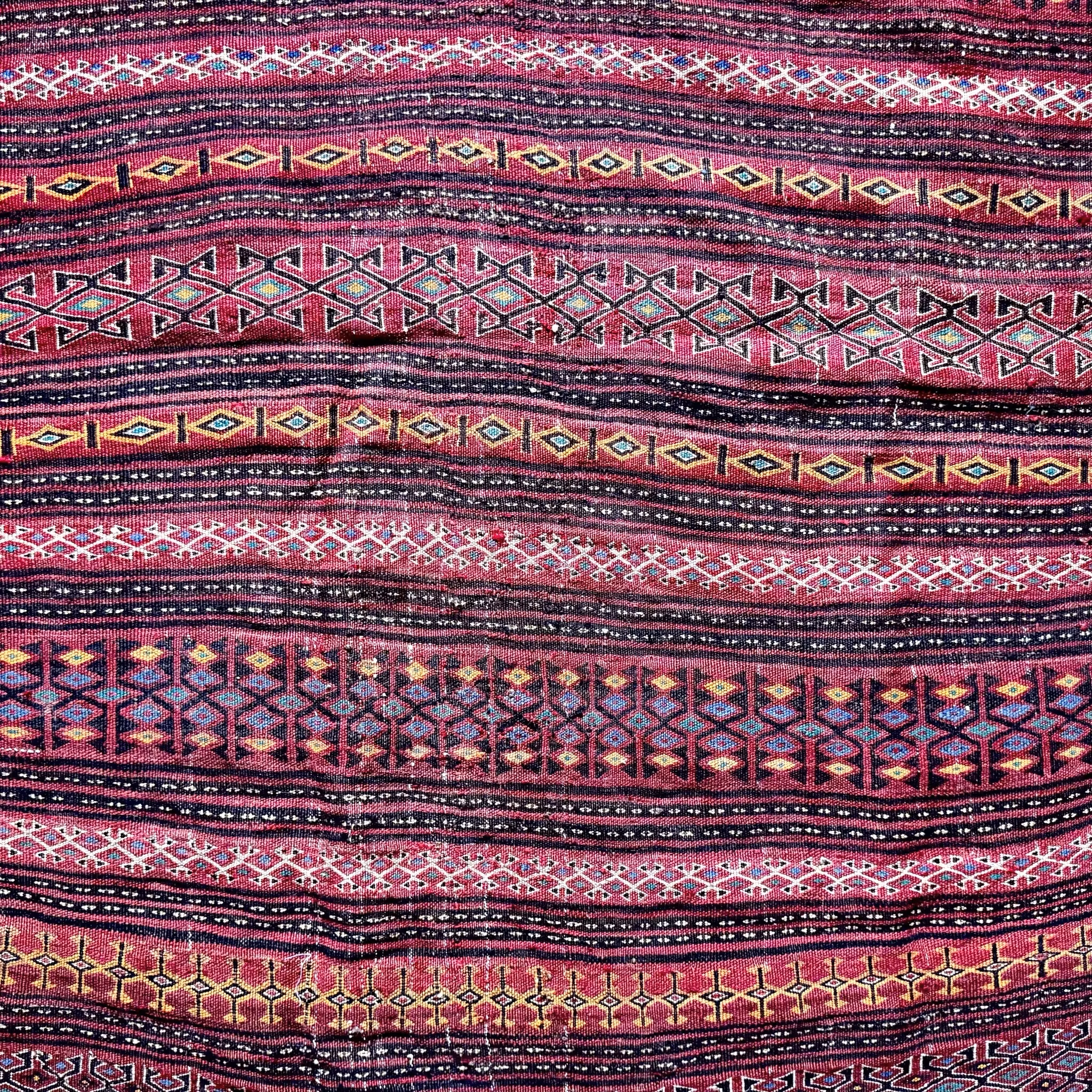 Färgpaletten domineras av rött, mörkrosa, gult, blått och svart, med mönster av diamanter, gitter och zigzagband längs kanterna. Baksidan visar tydligt den handgjorda vävtekniken i naturfärgade ulltrådar.