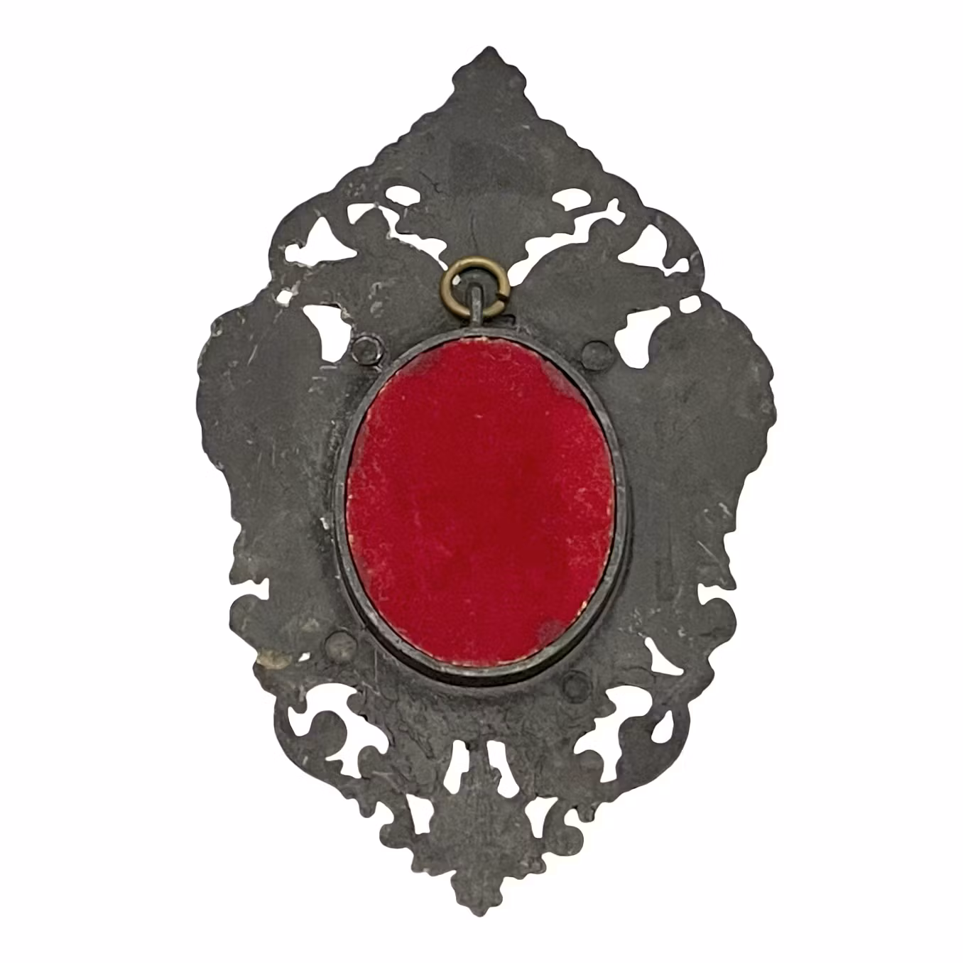Baksidan har röd sammet och en ögleupphängning.