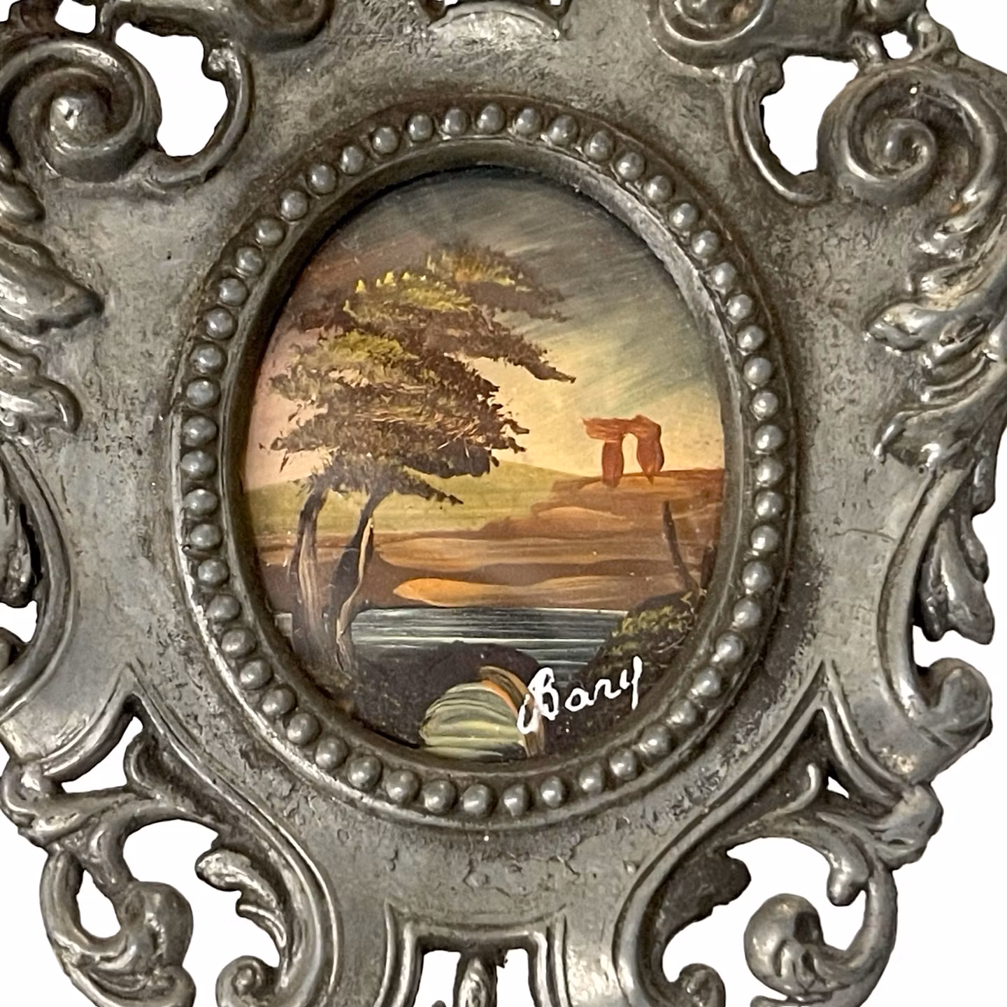 Vacker liten handmålad miniatyrmålning på oval platta, föreställande landskap med träd, vatten och klippor i varma toner. Signerad Bary.