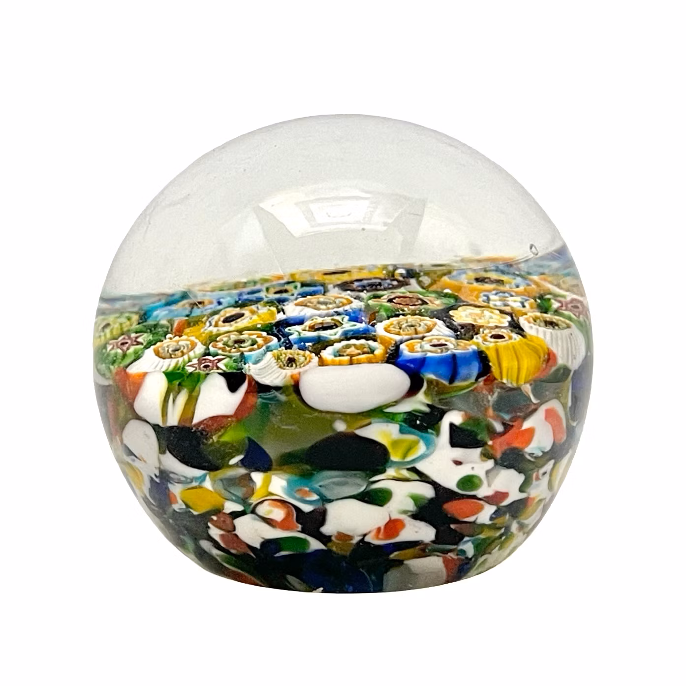 Exklusiv handgjord brevpress i äkta Murano glas, tillverkad i Italien med den klassiska millefiori tekniken. Inuti det klara glaset ligger tätt arrangerade blom formade glas murriner i starka och harmoniska färger. En högkvalitativ och tung paperweight med vacker kupolform och djup optisk effekt.