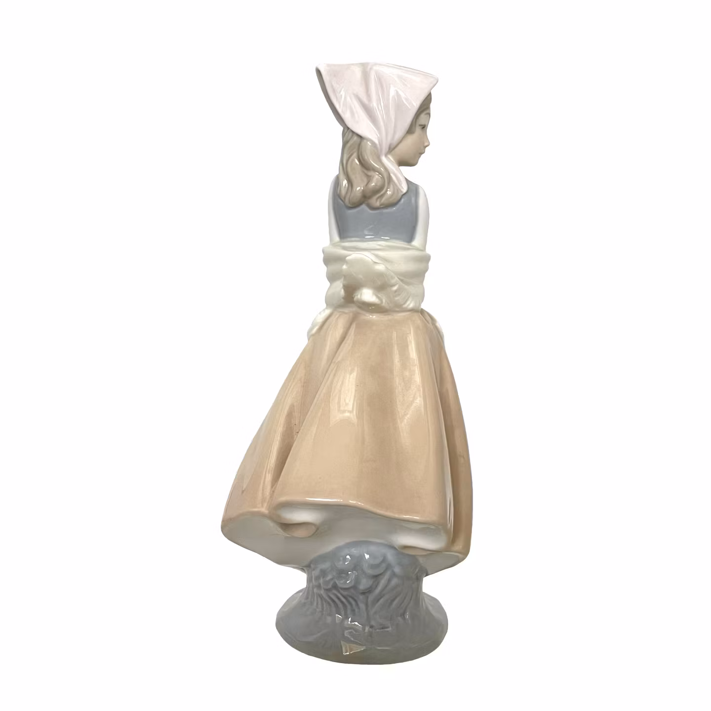 Vacker porslinsfigur från det spanska märket Nao by Lladro, handgjord i Spanien. Figuren föreställer en ung flicka med sjal och korg, utförd i mjuka pastellfärger och glaserad yta. Klassisk design från Lladro-fabriken i Valencia, känd för sina eleganta och detaljrika porslinsfigurer.