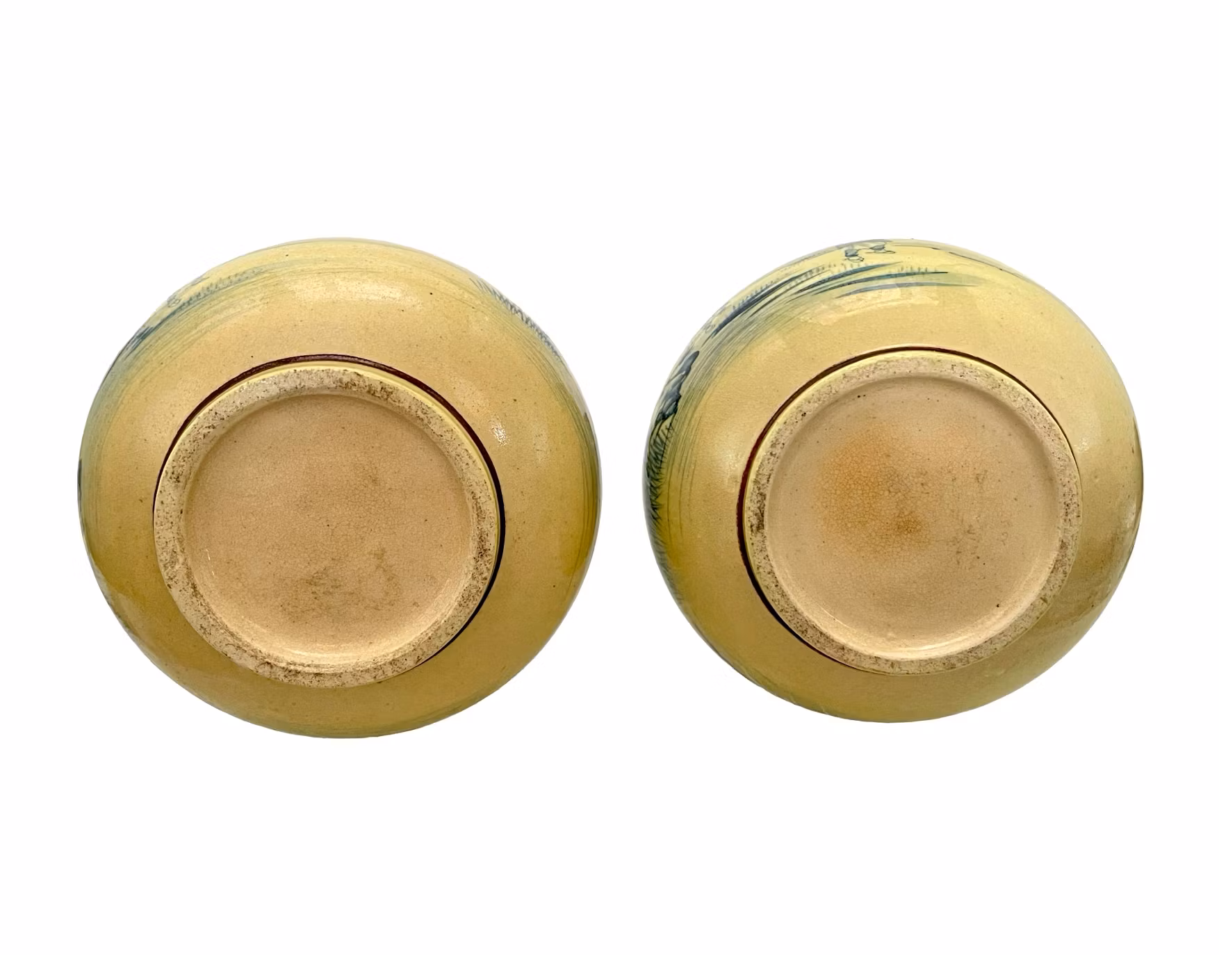 Motiven är utförda med blå pigmentfärg under glasyr, en teknik som förknippas med blå-vitt porslin, men här på varm gulbeige majolikabas.