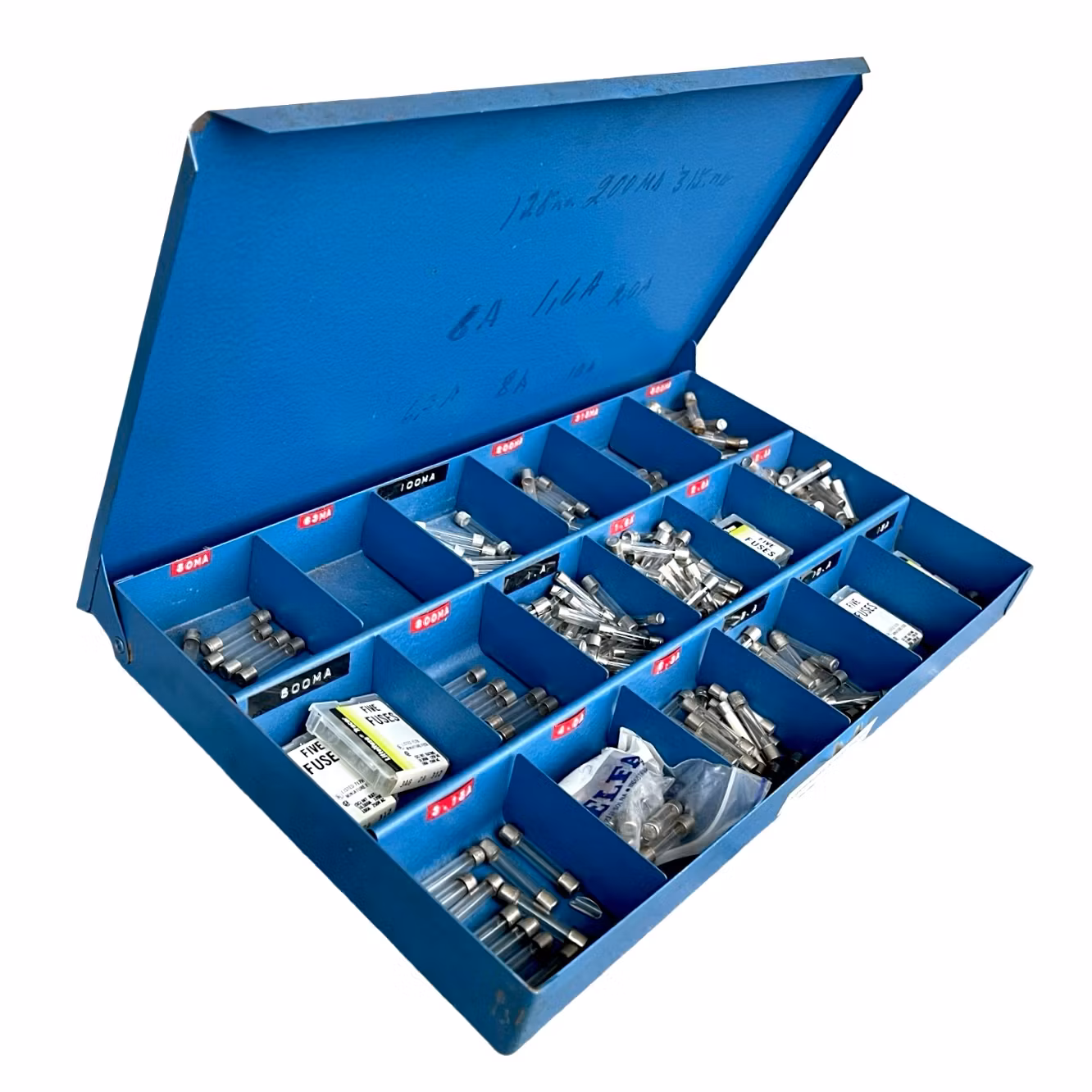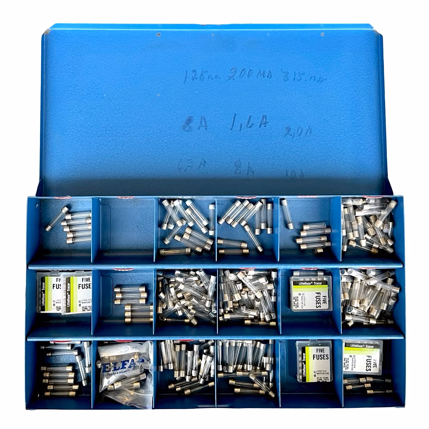 Stabil plåtlåda fylld med glasrörssäkringar i flera olika styrkor. Perfekt för elektronikreparation, verkstad eller hobbybruk.