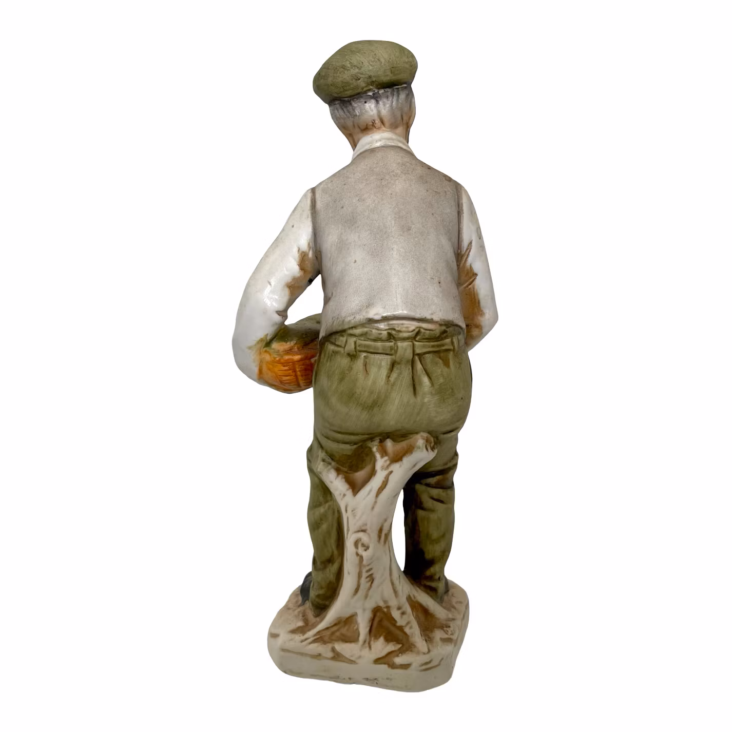 Vacker handmålad porslinsfigur föreställande en äldre man med skägg, klädd i skjorta, väst och keps, stående med korg och grep.