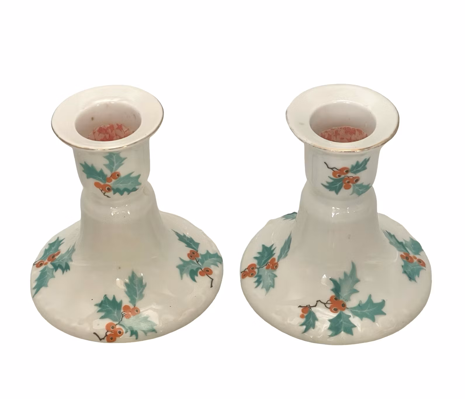 Elegant par ljusstakar i vit glaserad porslin med klassiskt julmotiv av järneksblad och röda bär. Dekorerade med tunn guldkant runt öppningen. Stilfulla och tidstypiska - passar både som juldekoration och som samlarobjekt.