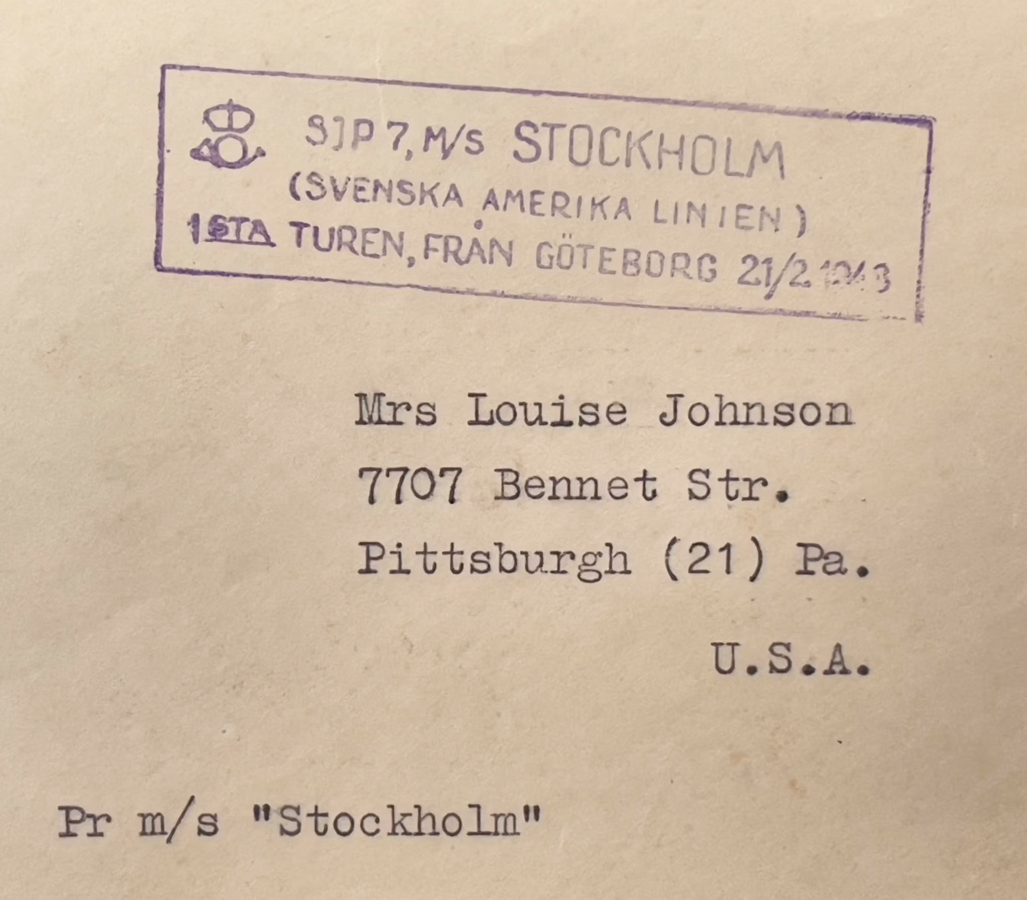 "SJP 7, M/S Stockholm - Svenska Amerika Linien - 1:a turen från Göteborg 21/2/1948" - Adresserat till Mrs Louise Johnson, Pittsburgh, Pennsylvania, USA.