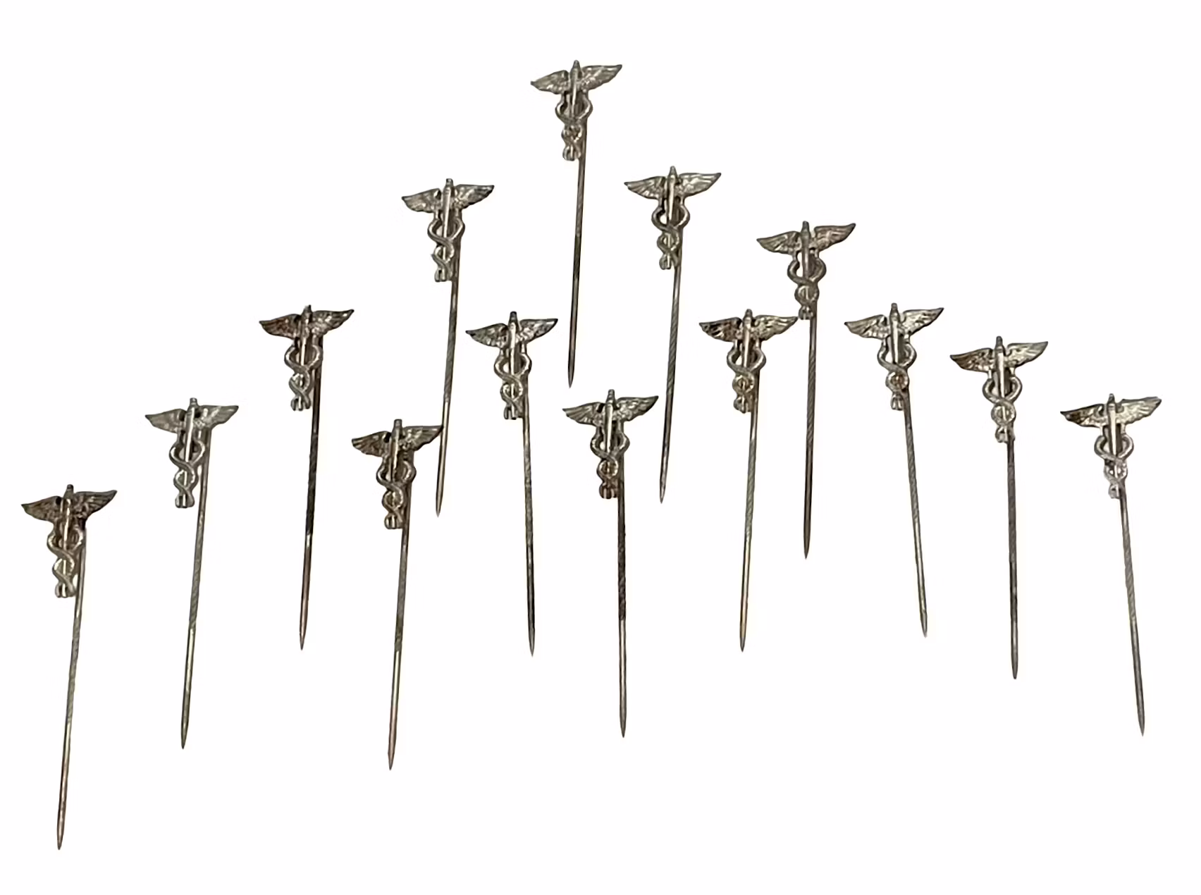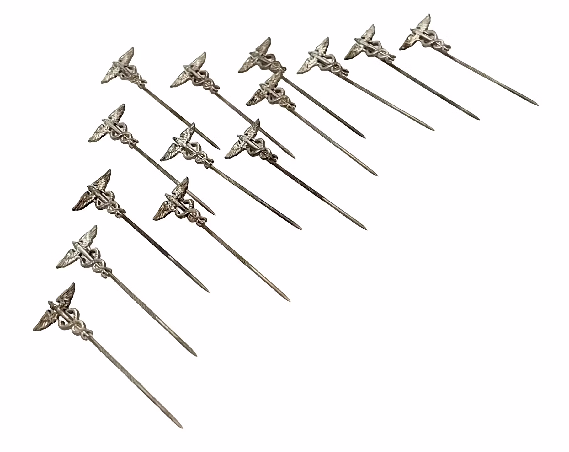 Ett komplett set med 14 detaljerade medicinska nålar, alla prydda med det klassiska Caduceus emblemet - två ormar kring en stav med utbredda vingar. Dessa nålar är ofta förknippade med sjukvården och medicinsk utbildning, och de är attraktiva för både samlare och dekoration.