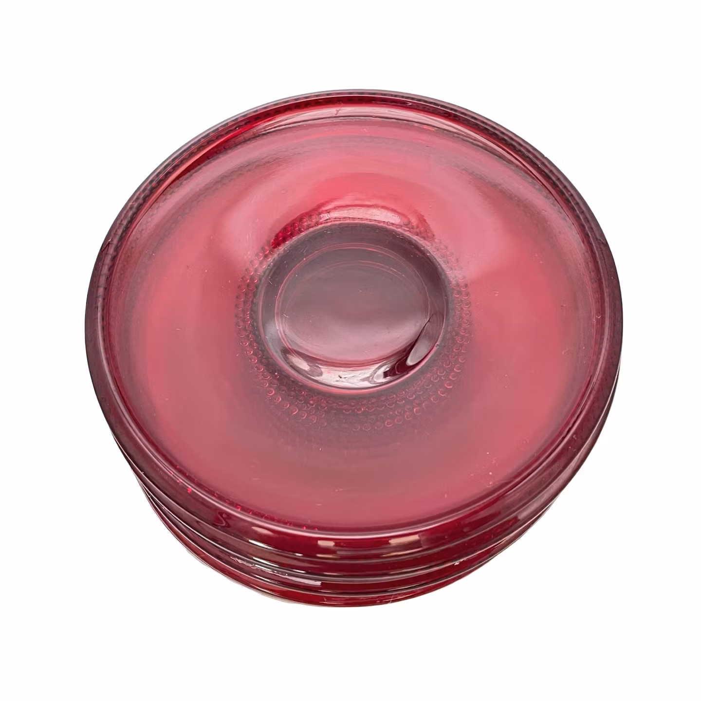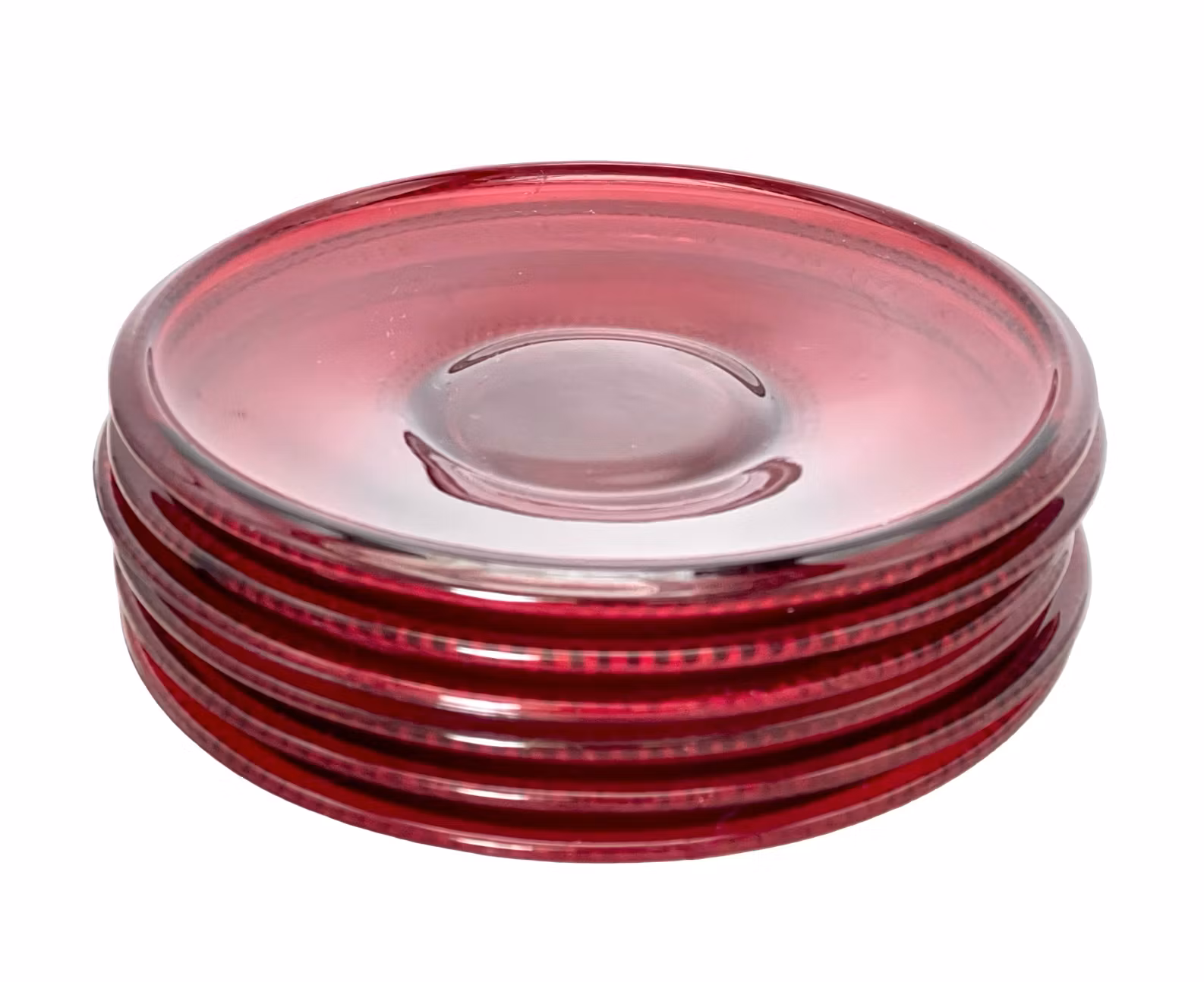 Röda assietter i pressat glas med prickdekor på undersidan och en elegant, retro känsla.