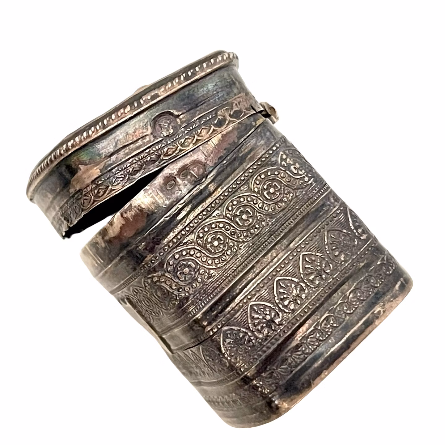 En vackert handgjord dosa i äkta silver från 1800-talets Nederländerna. Föremålet är rikt dekorerat med traditionella ornament, bladrankor och detaljerad runt hela kroppen. Locket är gångjärnsfäst och rikt utsmyckat med filigranliknande mönster. På framsidan finns en liten sköldformad yta, ursprungligen avsedd för monogramgravyr.