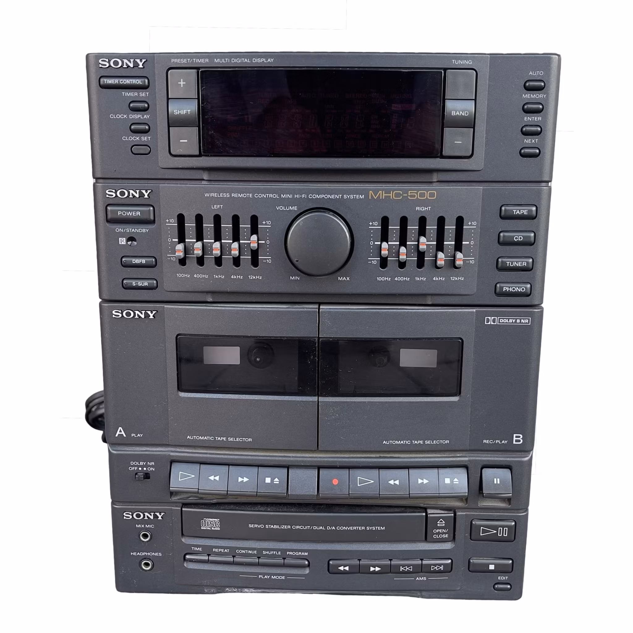 Säljer ett klassiskt Sony MHC-500 mini hi fi system. Detta är ett kompakt stereosystem från Sony med CD spelare, dubbel kassett spelare, radio (tuner), equalizer och externa ingångar. Perfekt för samlare, retro entusiaster eller för den som vill ha ett kraftfullt ljudsystem i ett kompakt format.