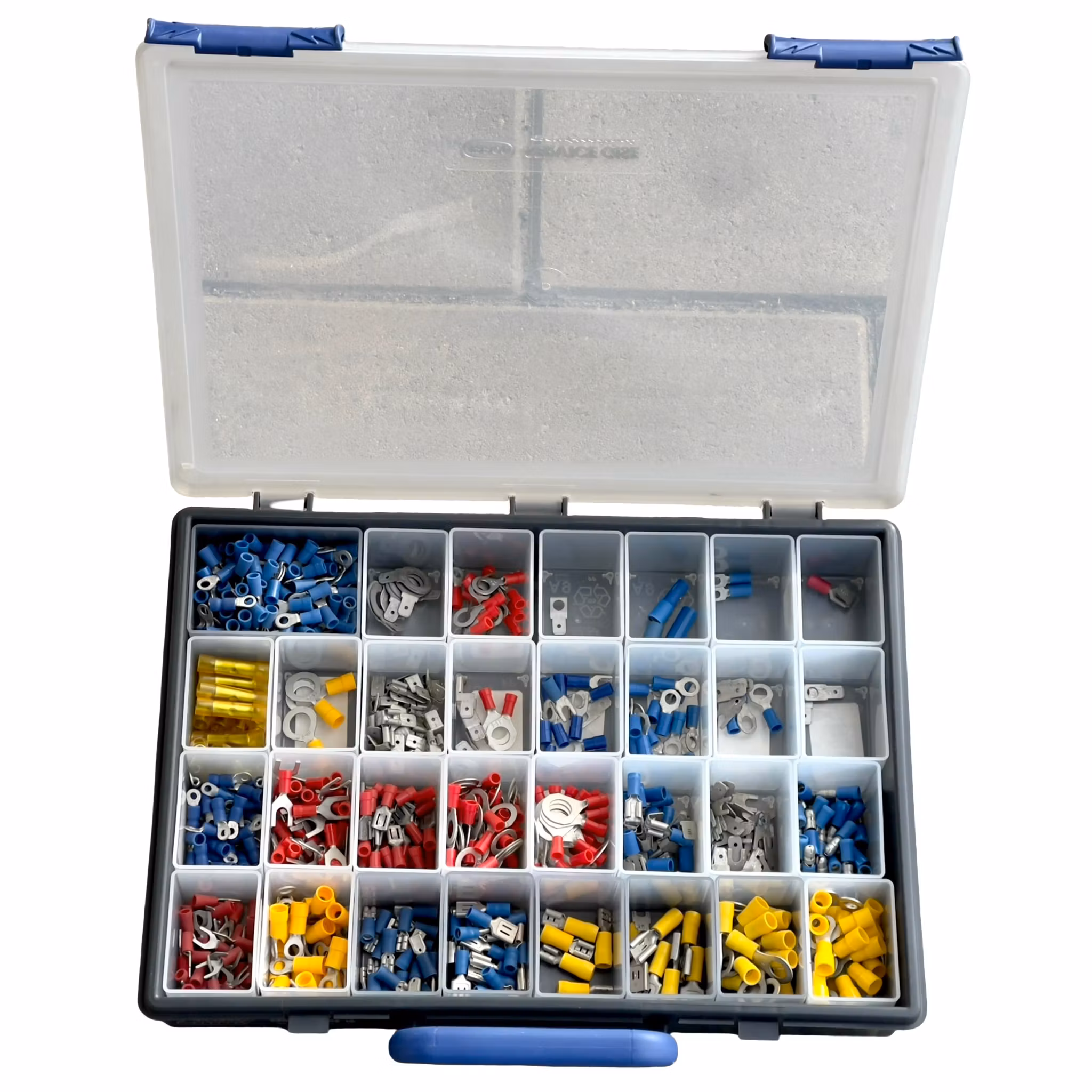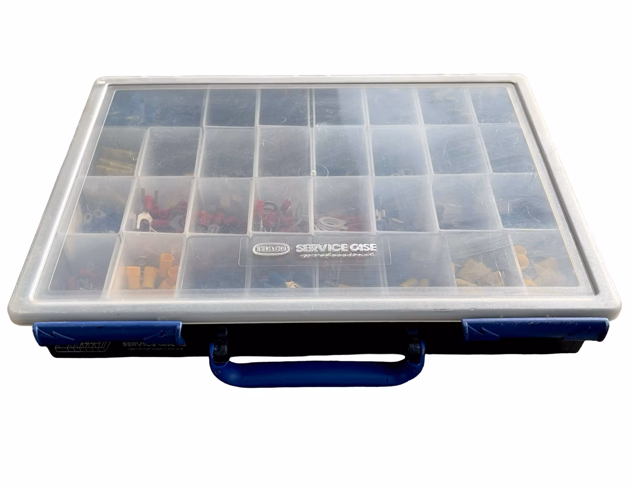 Till salu finns en praktisk och välfylld sortimentslåda / service case med ett större blandat innehåll av kabelskor, kabel terminaler, ringkabel skor, flat stift, skarvhylsor och andra el anslutningar.