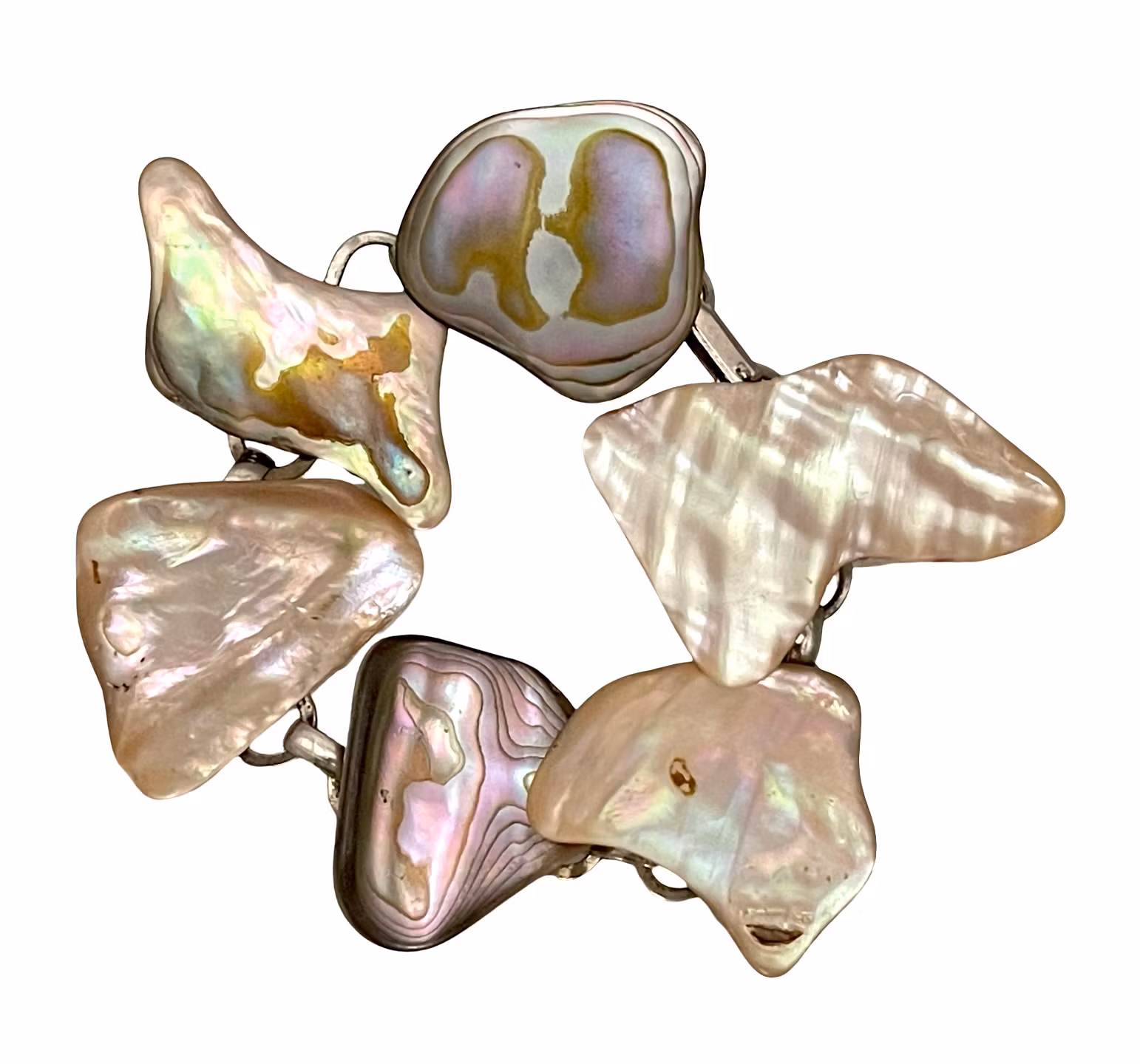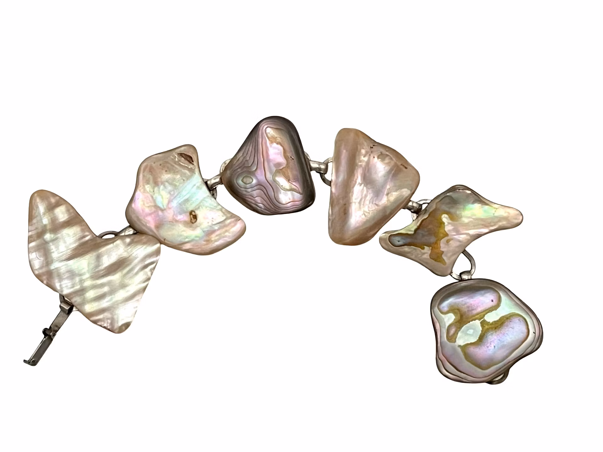 Ett unikt, handgjort armband med sex naturliga snäckbitar i organiska former och vacker irisering. Varje del har sitt eget färgspel i pärlvitt, rosa, grönt, guld och mörkare toner, vilket ger armbandet ett uttrycksfullt och exklusivt utseende. Länkat med metall och stängt med ett viklås perfekt både till vardag och fest.