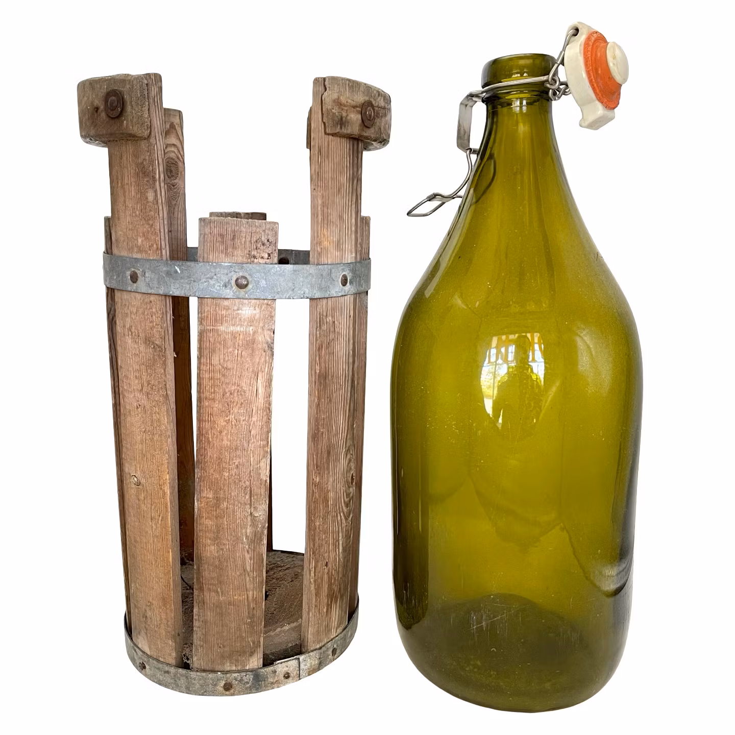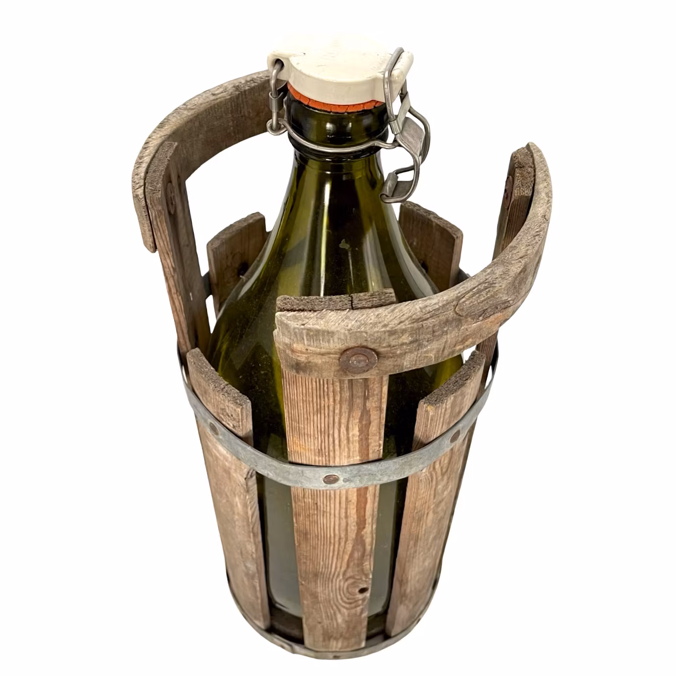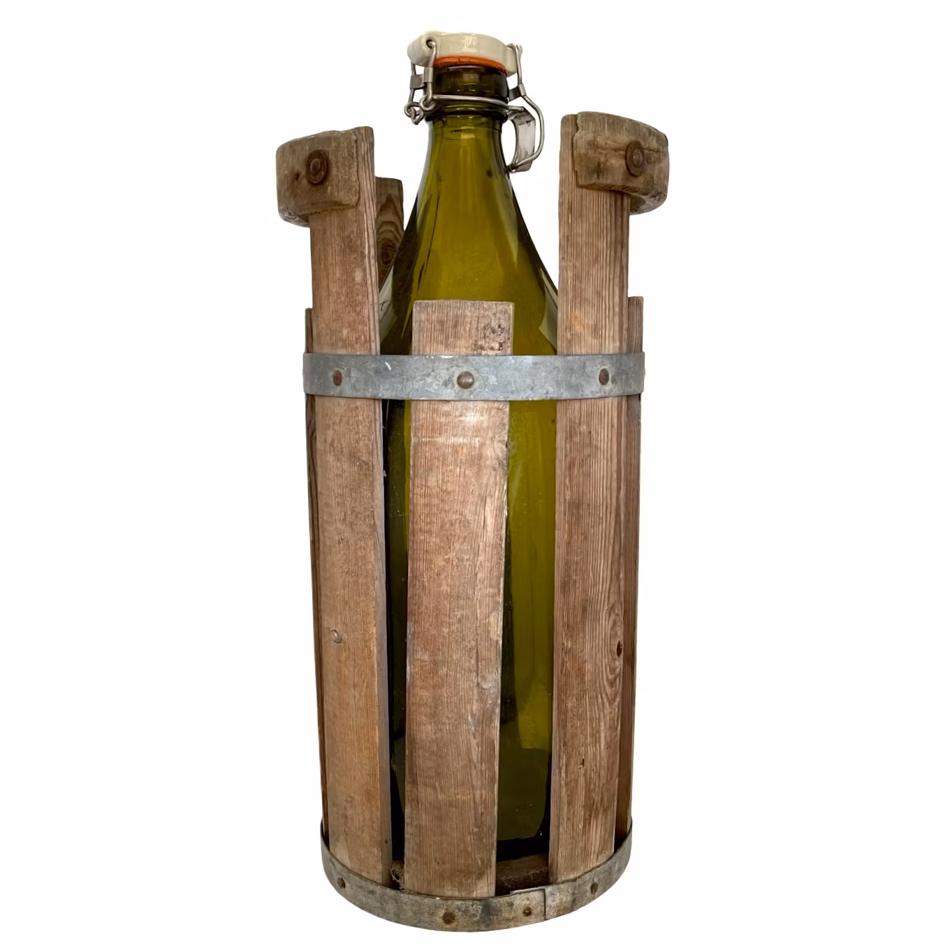 Flaskan är placerad i en tillhörande träställnig med beslag av galvaniserad plåt. Flaskan rymmer ca 3 liter