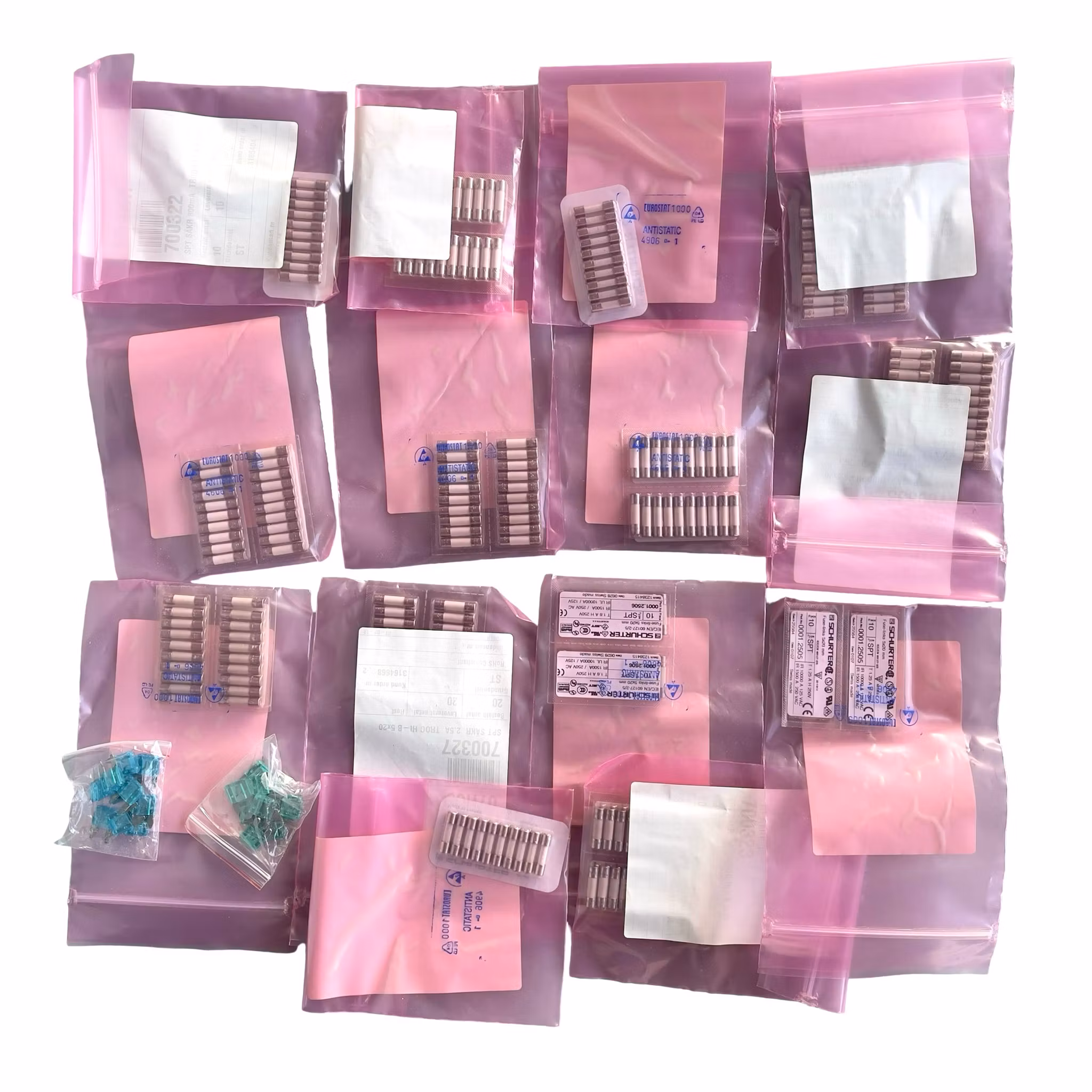 - Flera askar och rader med glasrörs säkringar