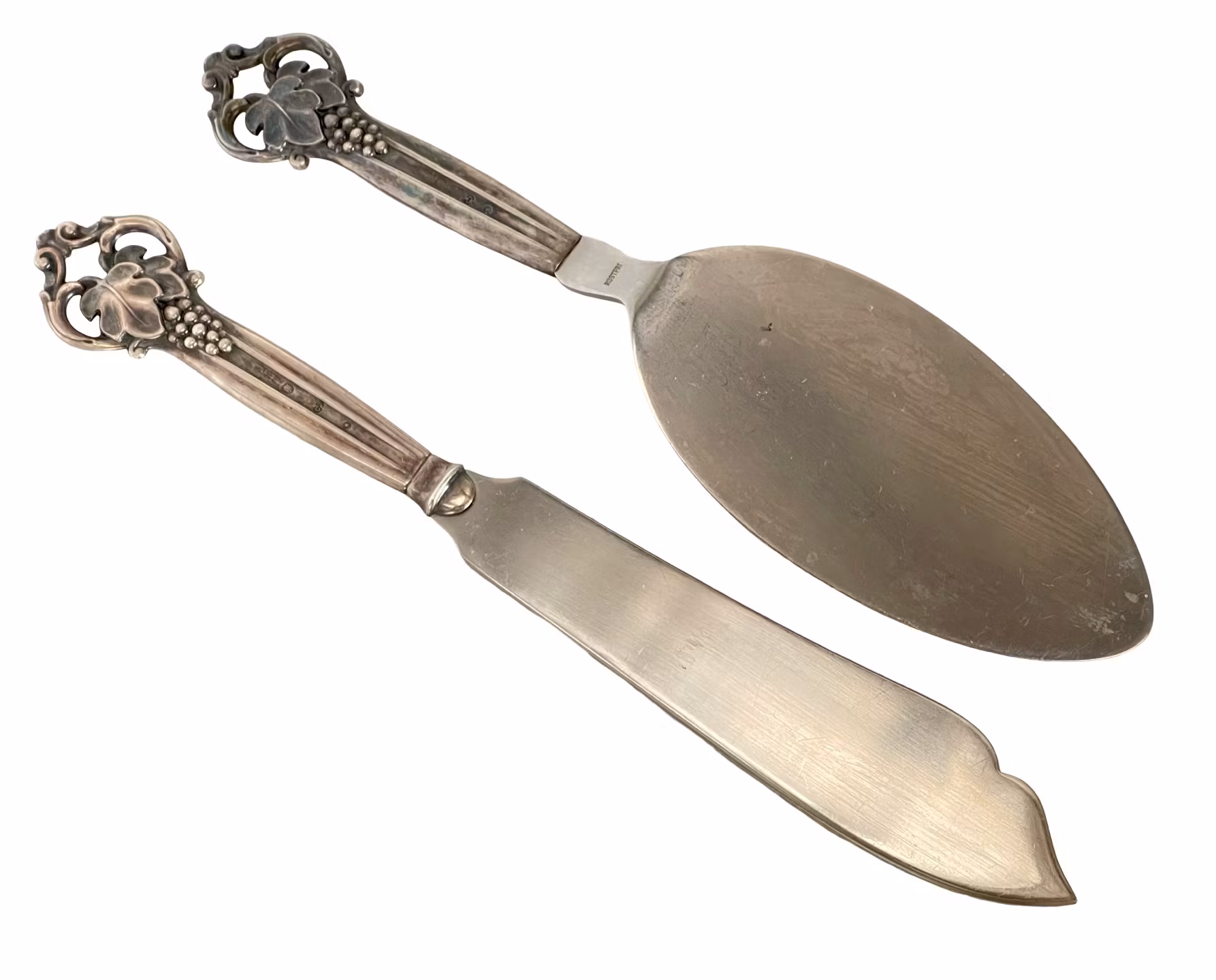 Elegant och välbevarat tårtset bestående av tårtspade och tårtkniv, med skaft i dansk silver och blad i rostfritt stål.