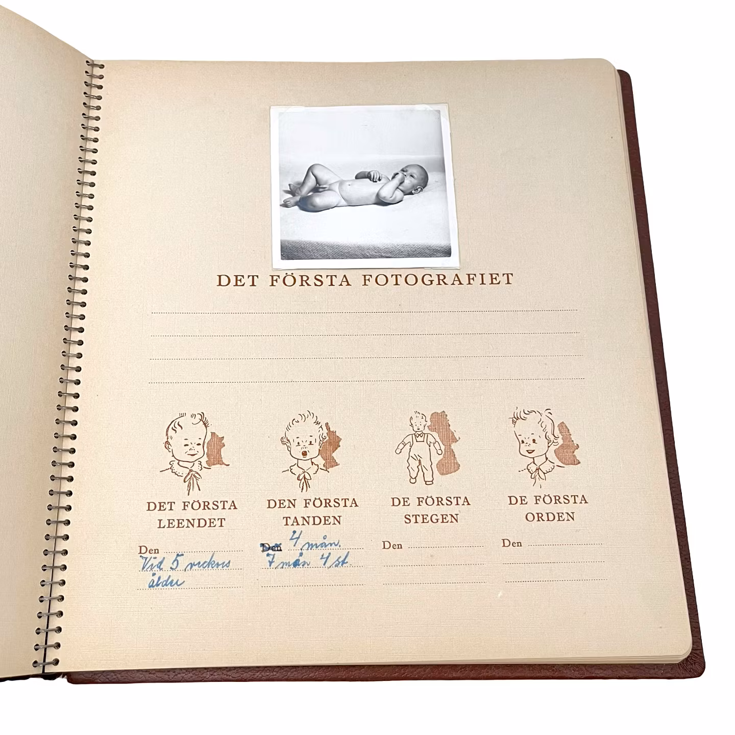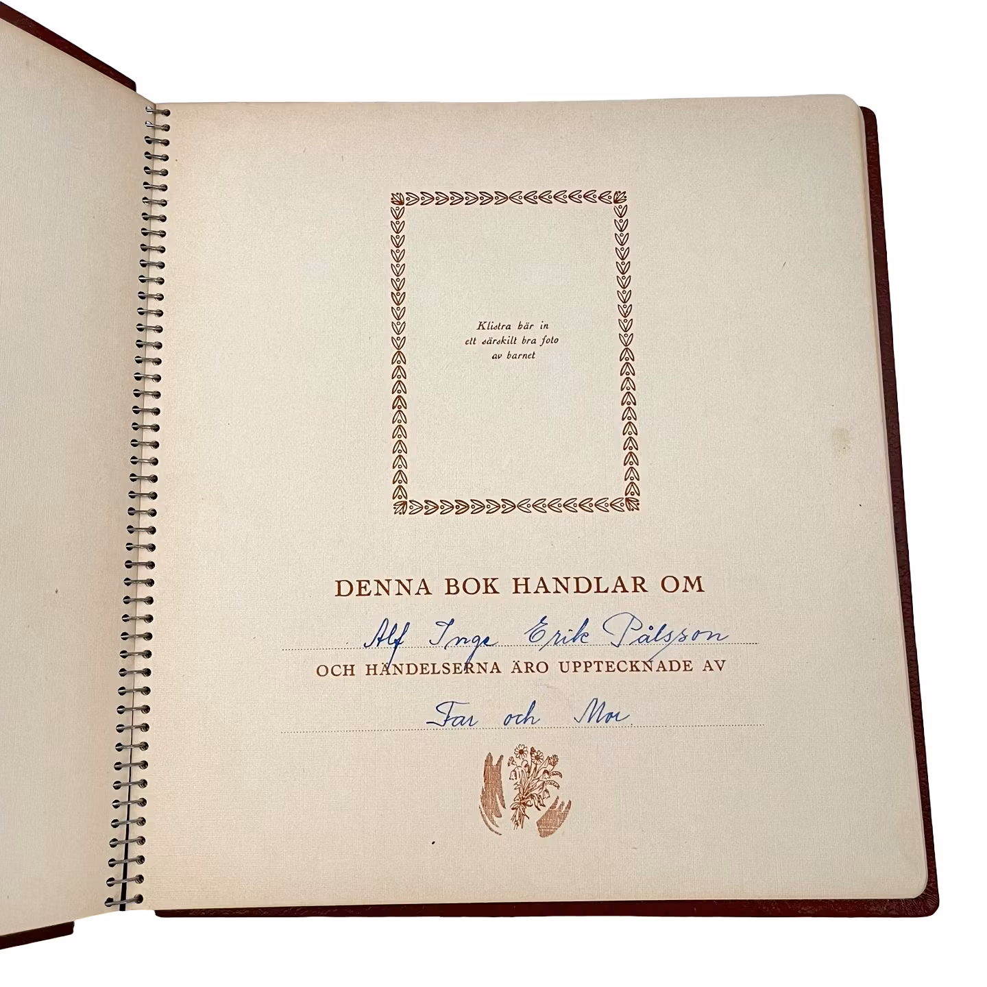 Ett välbevarat originalexemplar av den klassiska svenska babyboken "Vårt Barns Liv i ord och bild".
