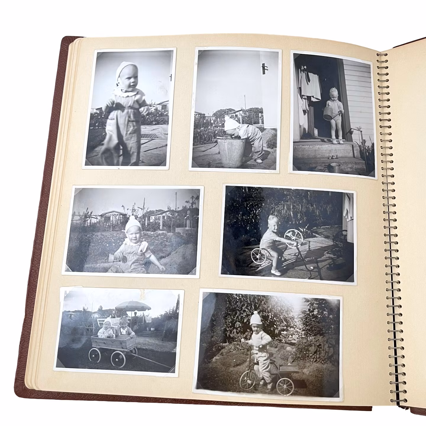 - Flera sidor med svartvita fotografier från barnets första år (1949–tidigt 1950-tal).