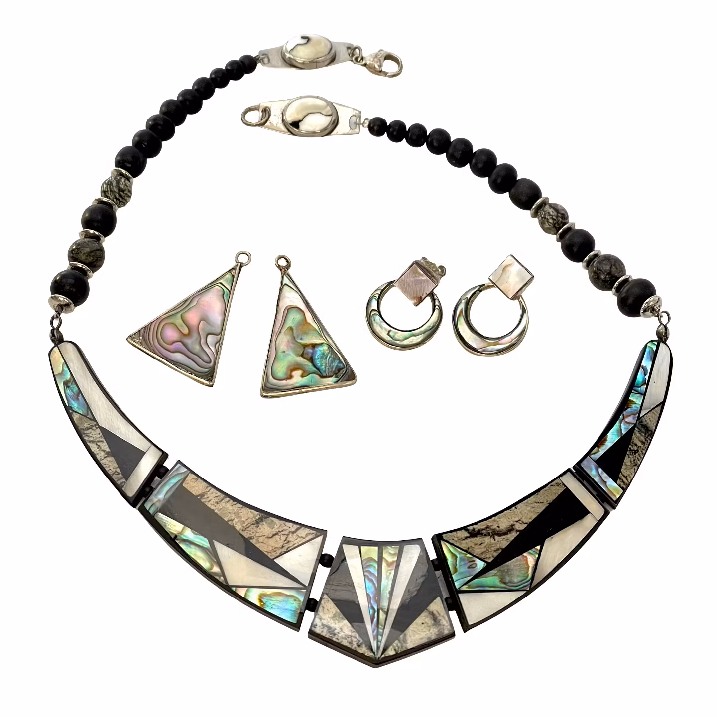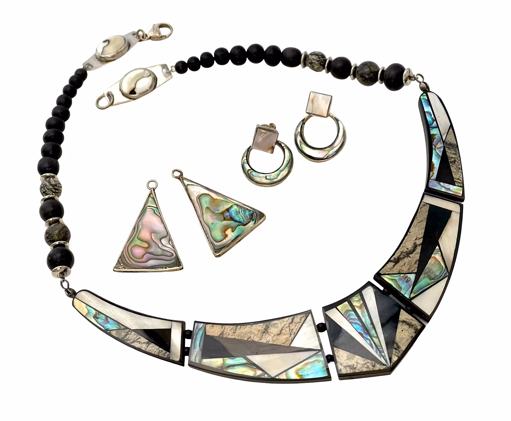 Vintage COLLIER & ÖRHÄNGEN 2 par, Pärlemor med Alpaca och silver lås, Mexico