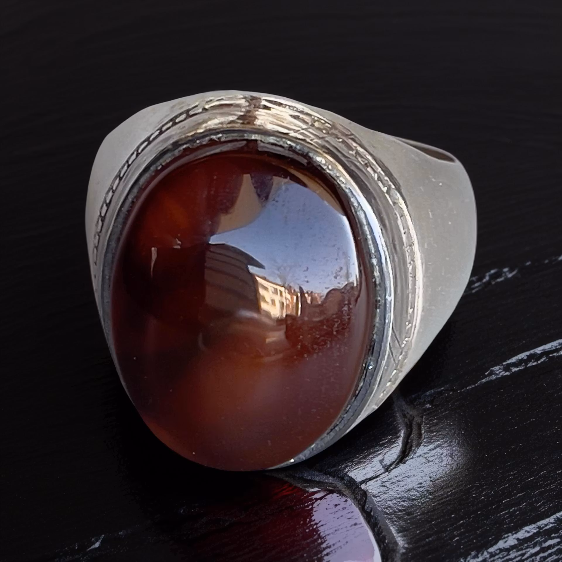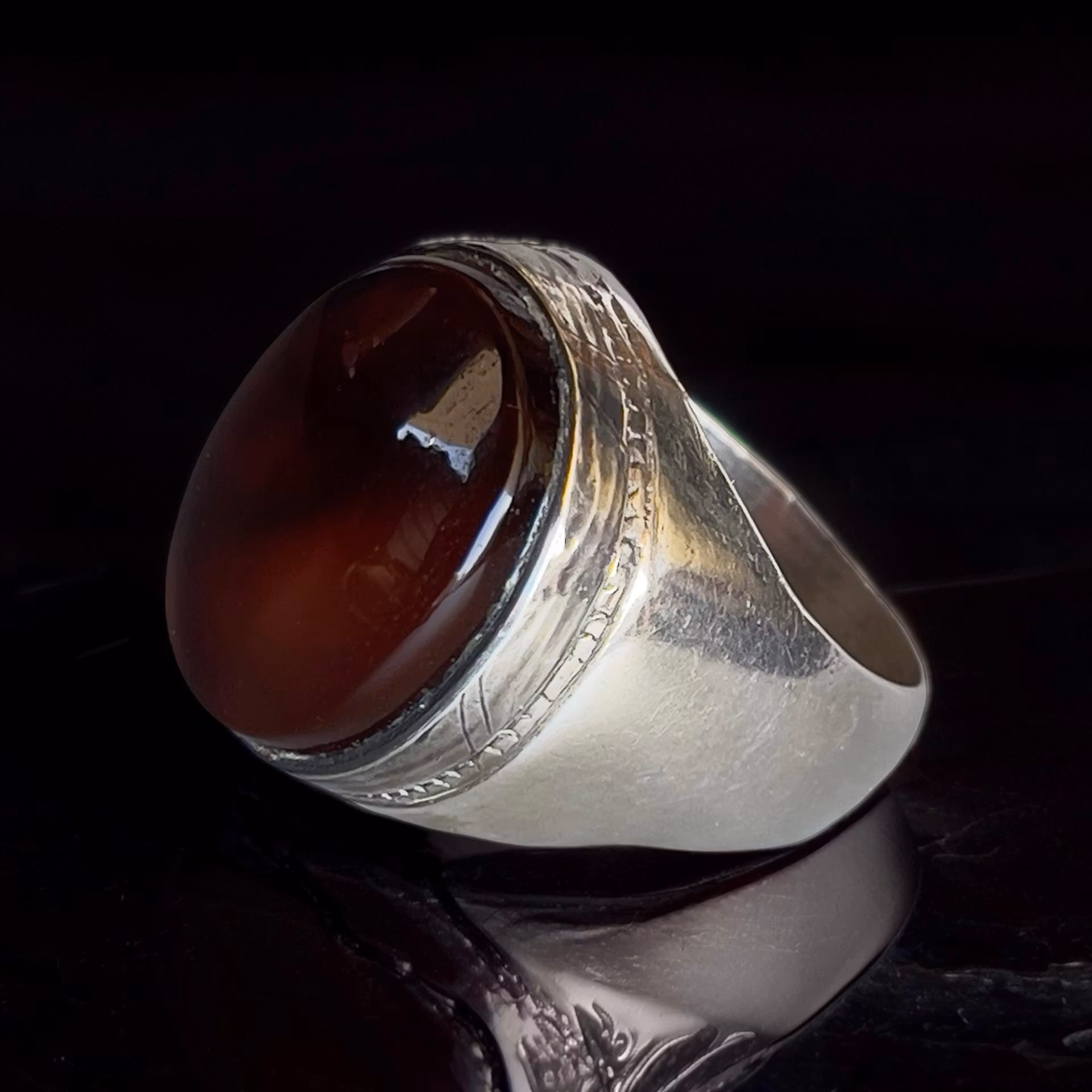 Stenen är naturlig och obehandlad, med djup mörkröd/svart ton som liknar leverfärg mycket eftertraktad inom jemenitiska och arabiska smycken. Klassisk kraftig design, stabil infattning och tydlig hantverks känsla.