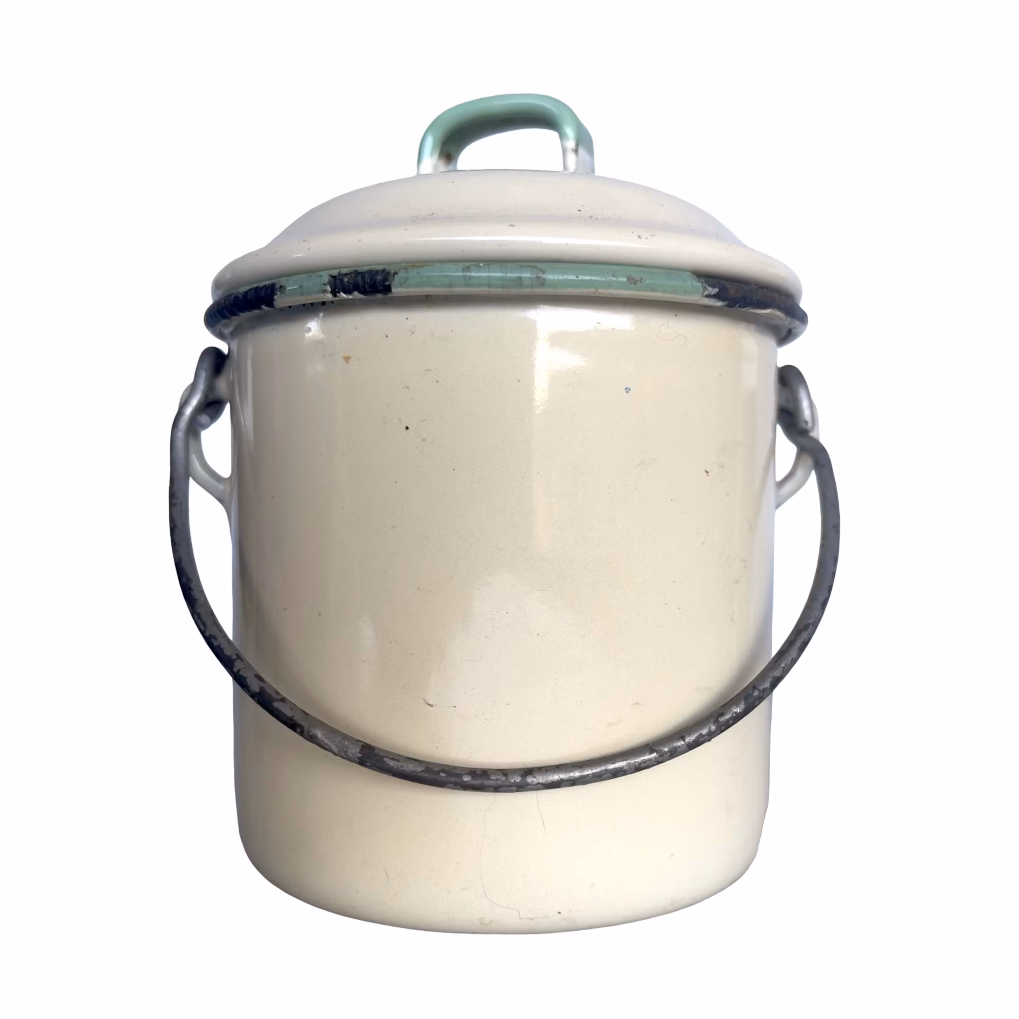 Ett vintage emaljerat köksset från Kockums, Sverige i den klassiska krämfärgade emaljen med grön kant. Denna design blev mycket vanlig i svenska hem under mitten av 1900-talet och är idag eftertraktad som retro köks utrustning och samlarobjekt.