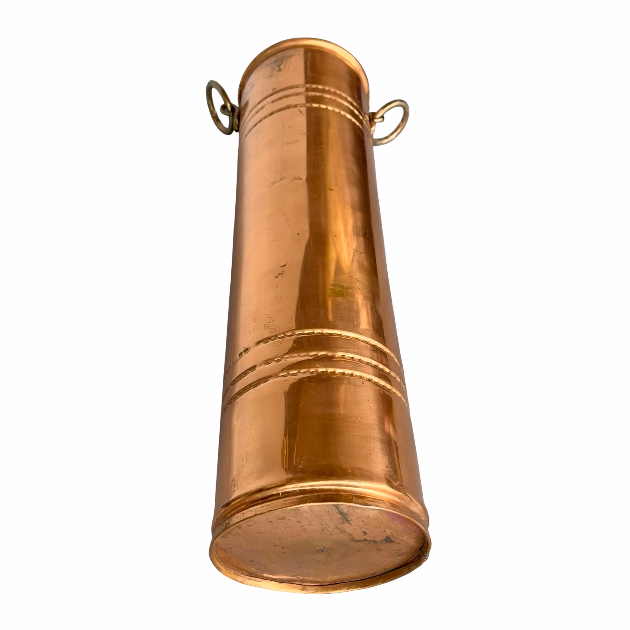Vacker hög kopparvas/kärl i klassisk äldre stil med ringhandtag. Troligen handgjord, med fin patina och dekorativa detaljer. Perfekt som inrednings detalj eller samlar objekt.