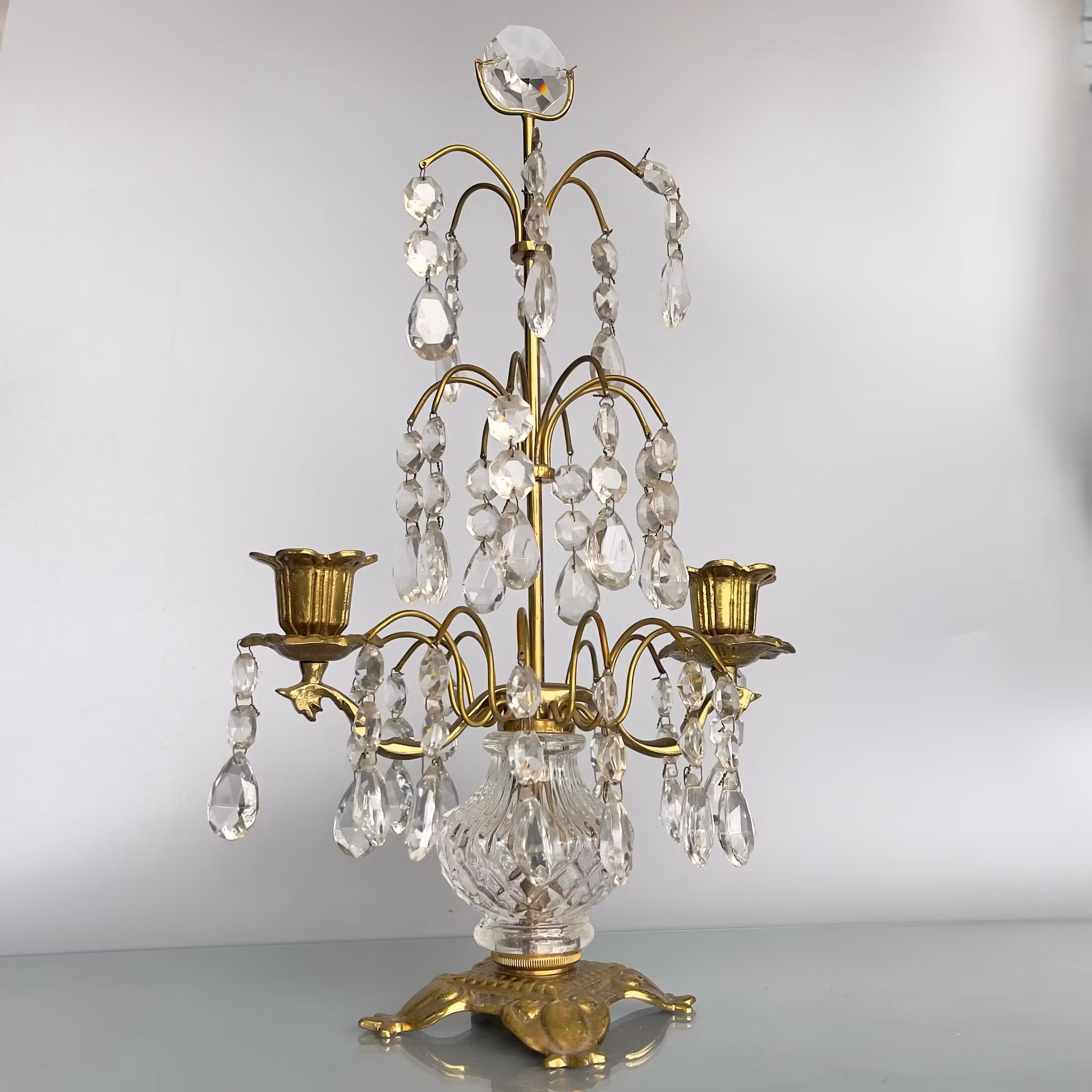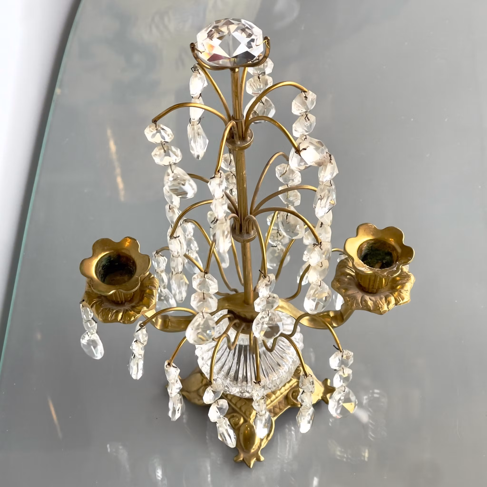 Vintage kristall kandelaber - 2 Armad bords ljusstake i mässing