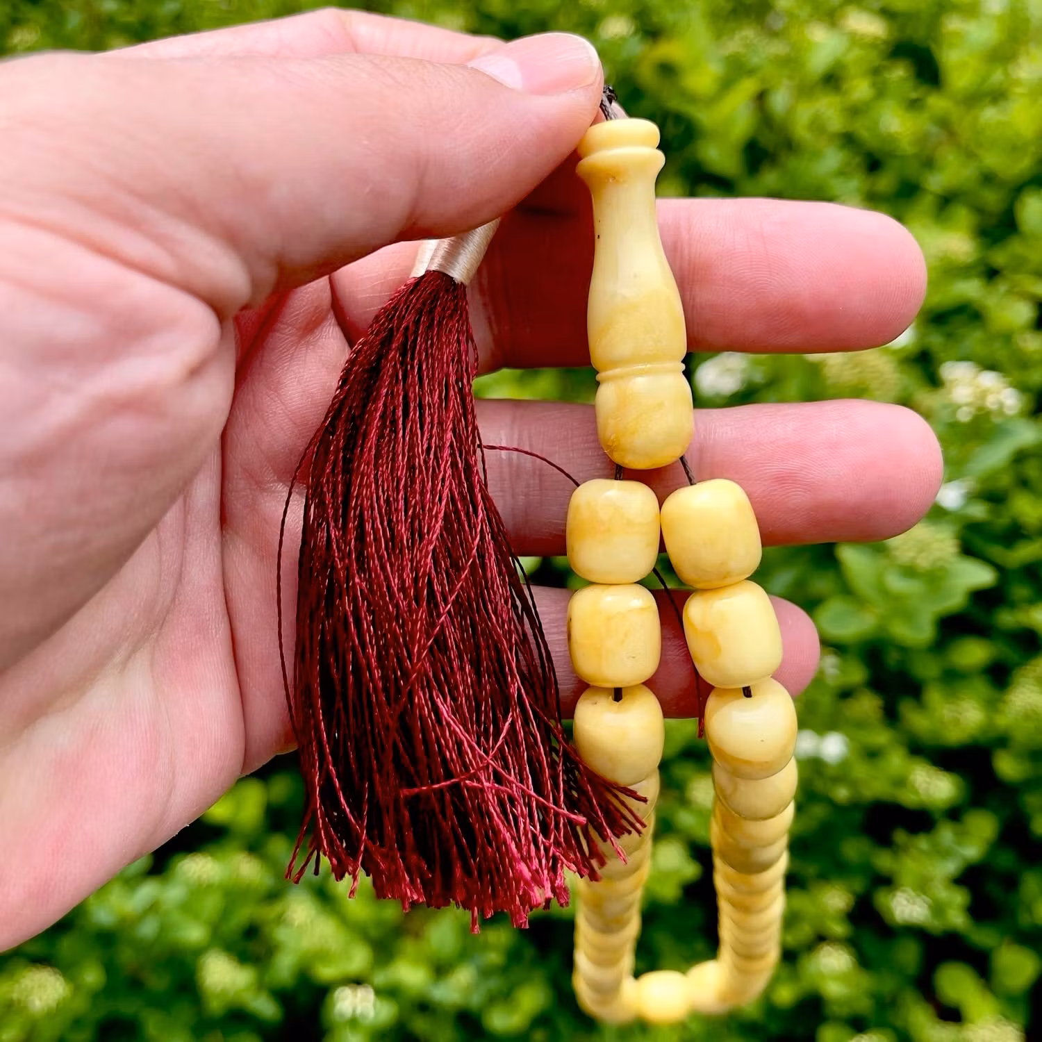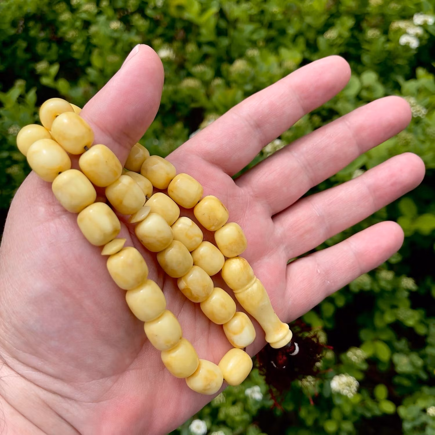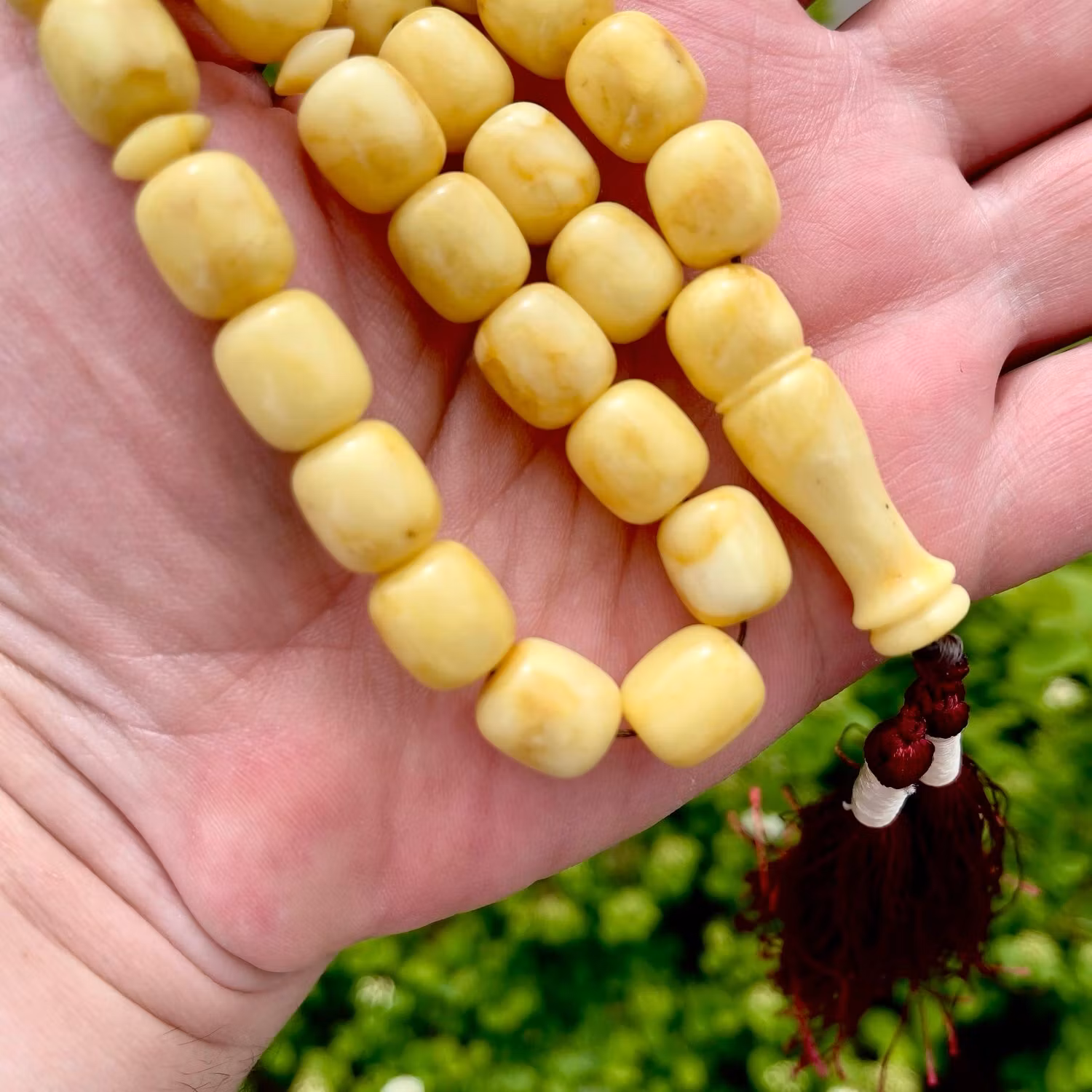 Vackert radband i naturlig pressad vit baltisk bärnsten. Ursprungligen var riktigt vit i tonen, men har med ålder utvecklat en varm krämgul nyans, vilket är typiskt för äldre bärnsten och ger ett fint, levande uttryck. Pärlorna har mjuk lyster och naturliga skiftningar. Klassisk modell med 33 pärlor och dekorativ röd tofs. Passar både som samlar objekt, smycke eller för bruk.