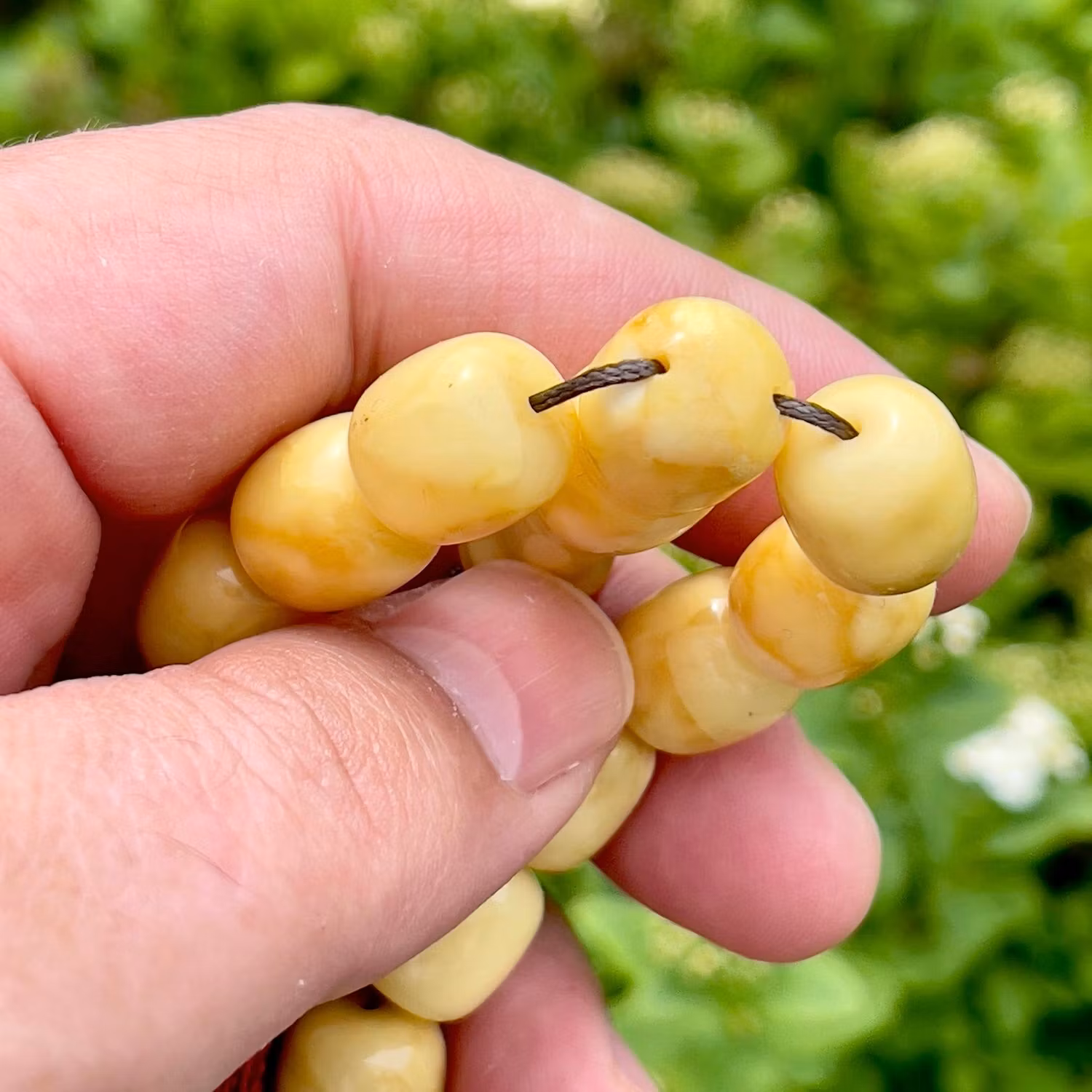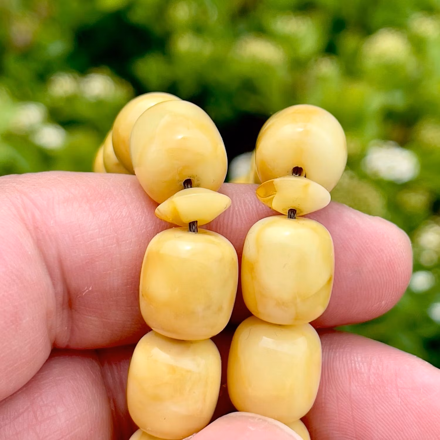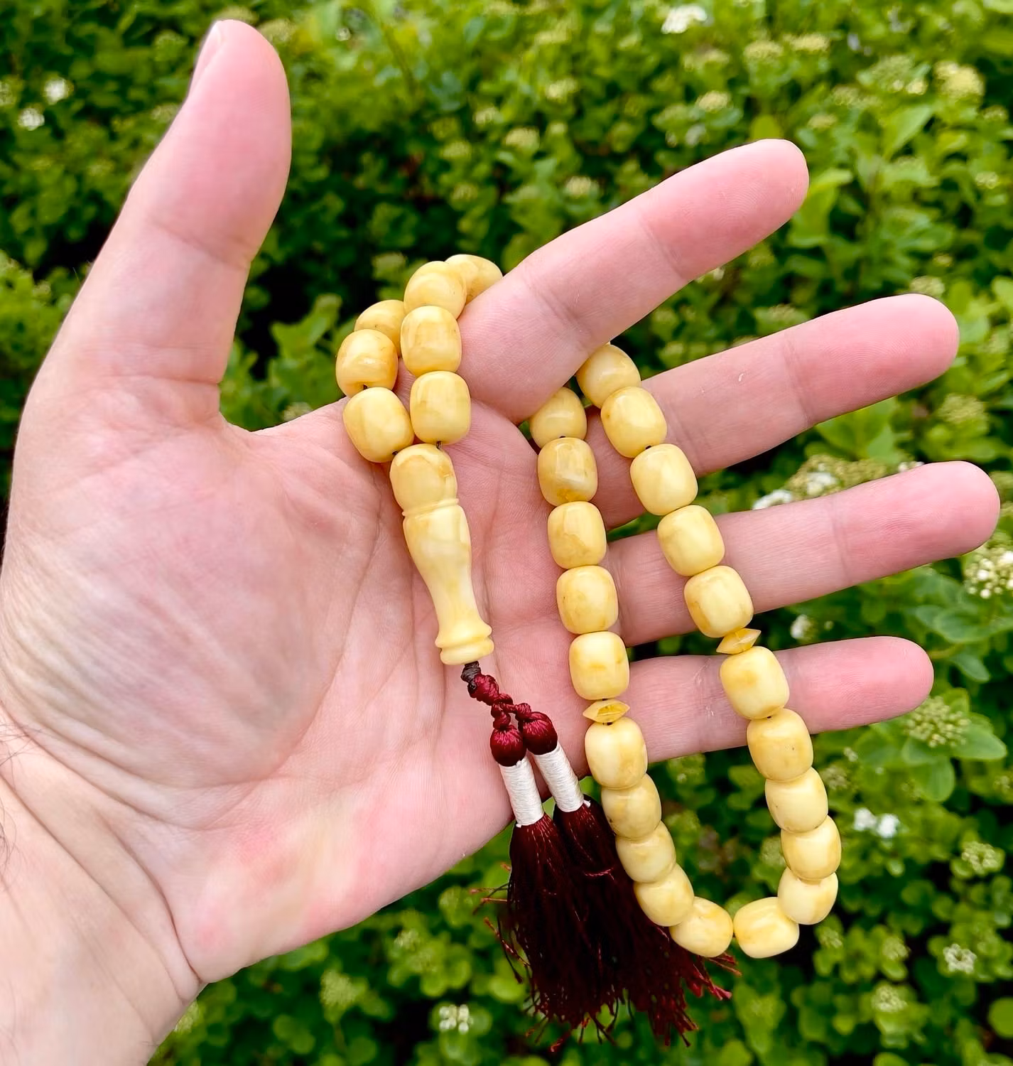 Vackert radband i naturlig pressad vit baltisk bärnsten. Ursprungligen var riktigt vit i tonen, men har med ålder utvecklat en varm krämgul nyans, vilket är typiskt för äldre bärnsten och ger ett fint, levande uttryck. Pärlorna har mjuk lyster och naturliga skiftningar. Klassisk modell med 33 pärlor och dekorativ röd tofs. Passar både som samlar objekt, smycke eller för bruk.