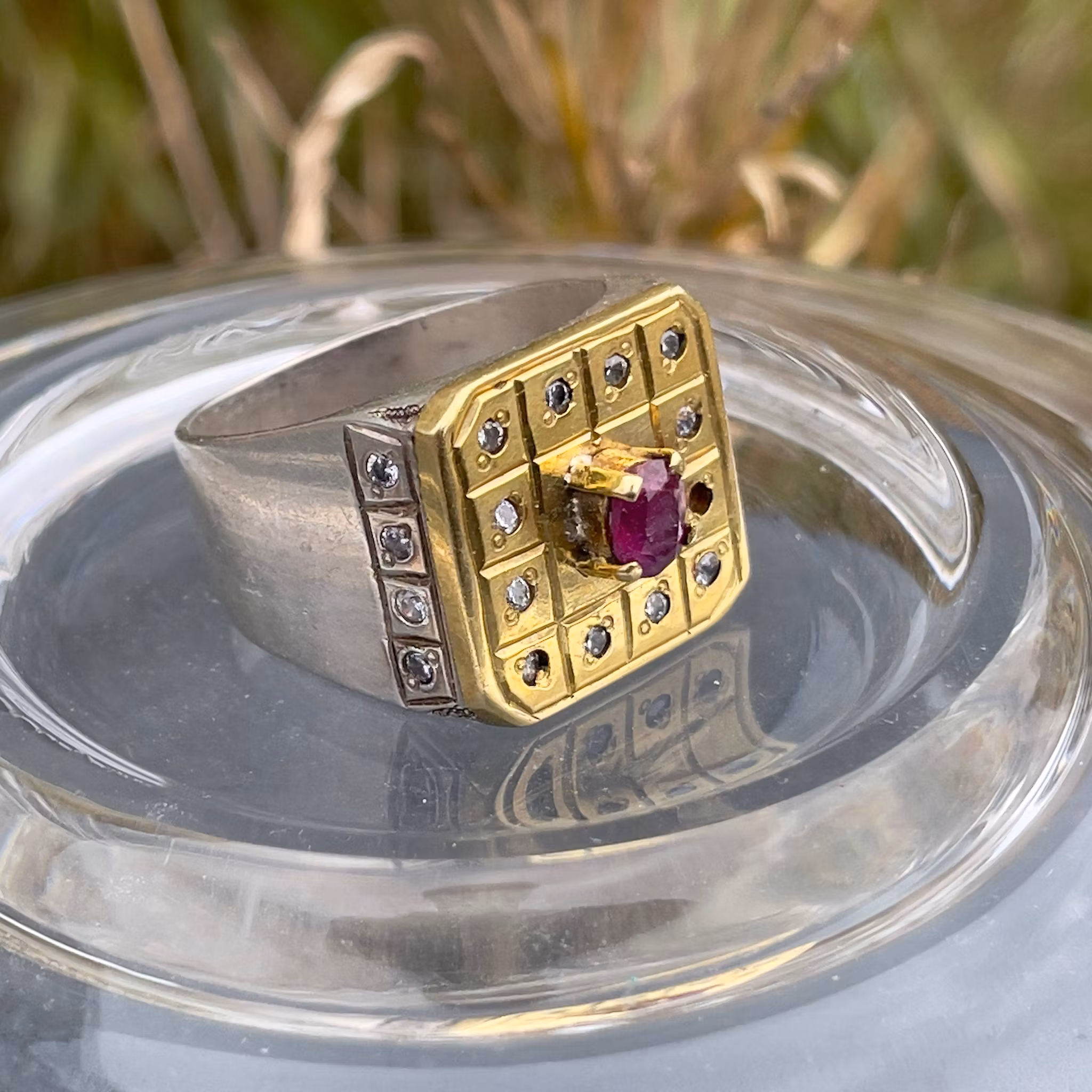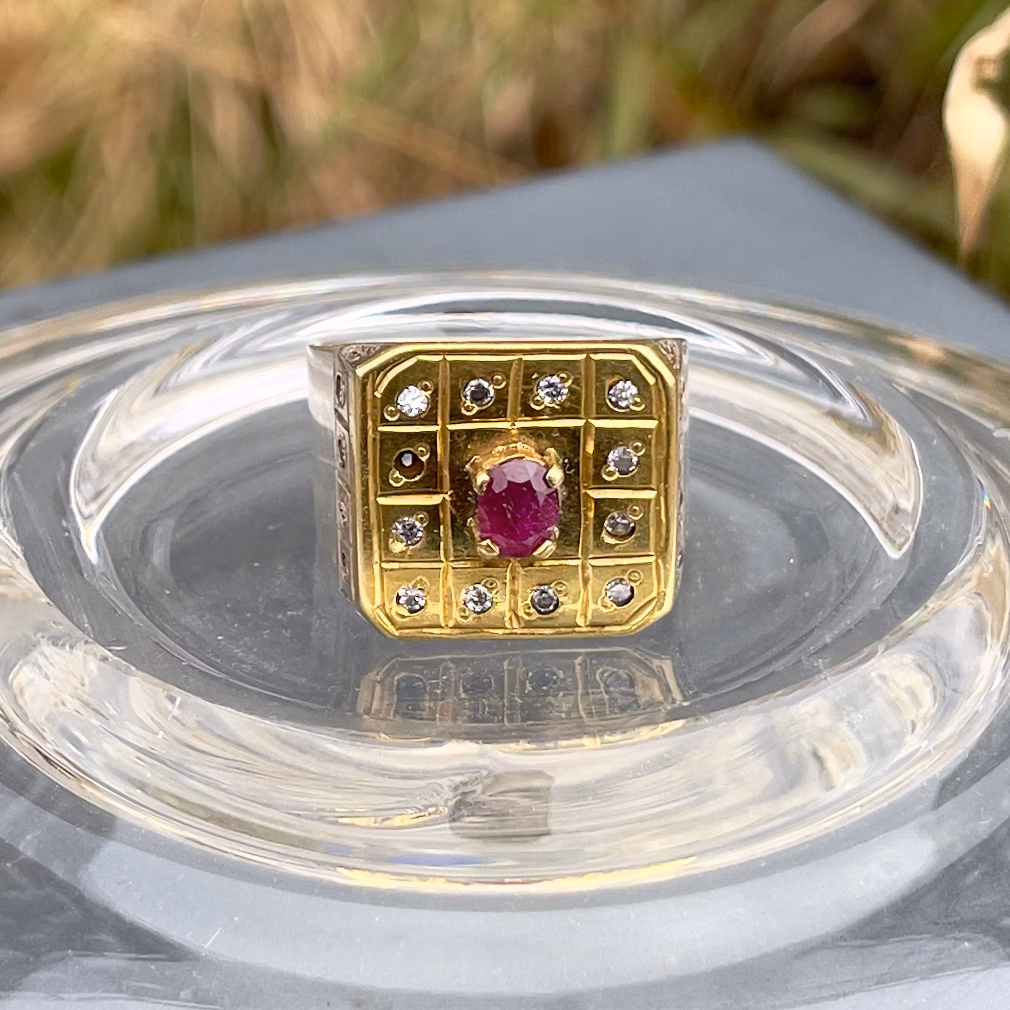 Vintage ring i sterling silver med dekorativ topp i guld färgad metall. I mitten sitter en naturlig rubin på cirka 0.35 carat, infattad i en klassisk klo infattning. Runt mittstenen finns flera små klara stenar i ett geometriskt rutmönster som ger ringen ett elegant och dekorativt uttryck.
