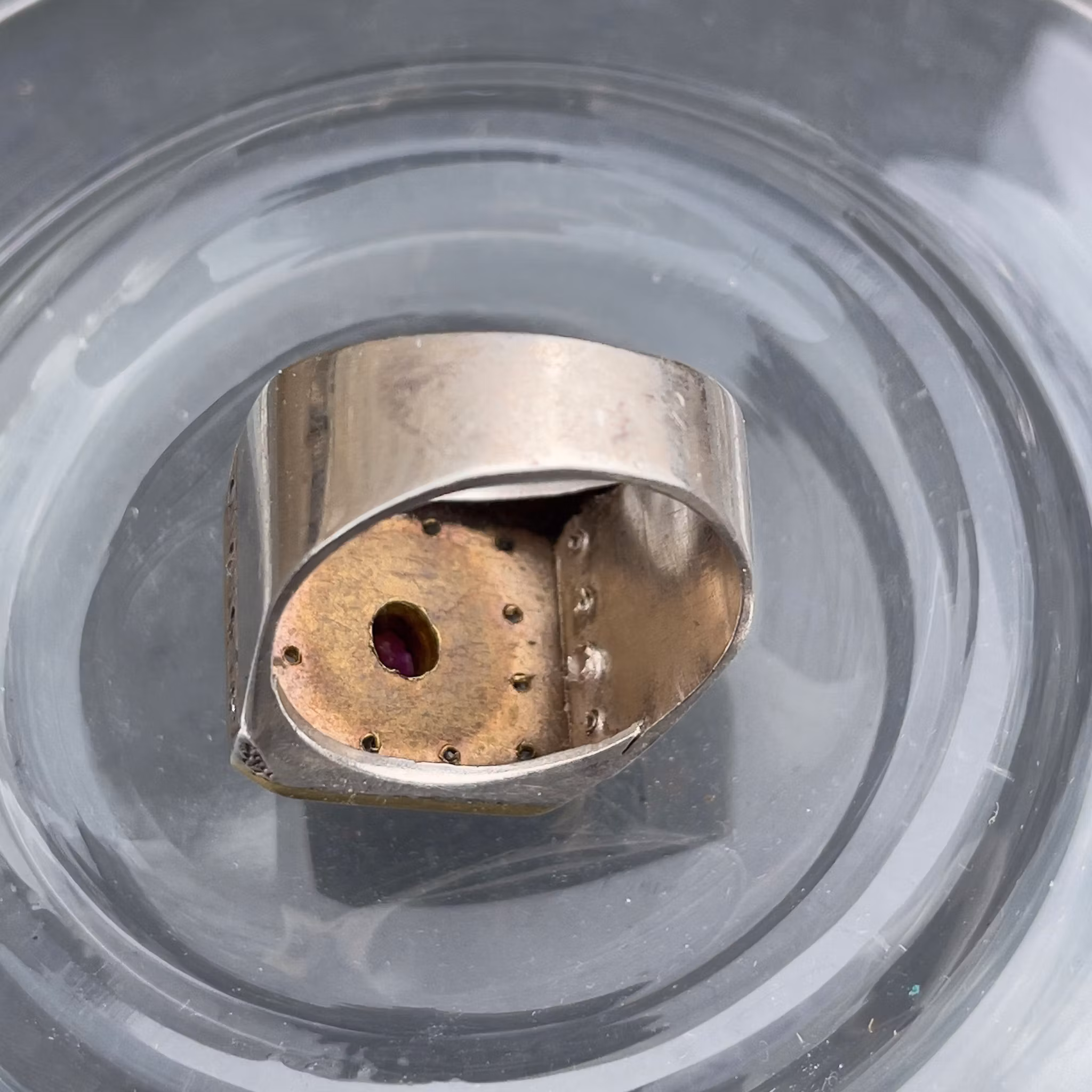 Kombinationen av silver, guldfärgad topp och rubin ger ett starkt visuellt intryck.