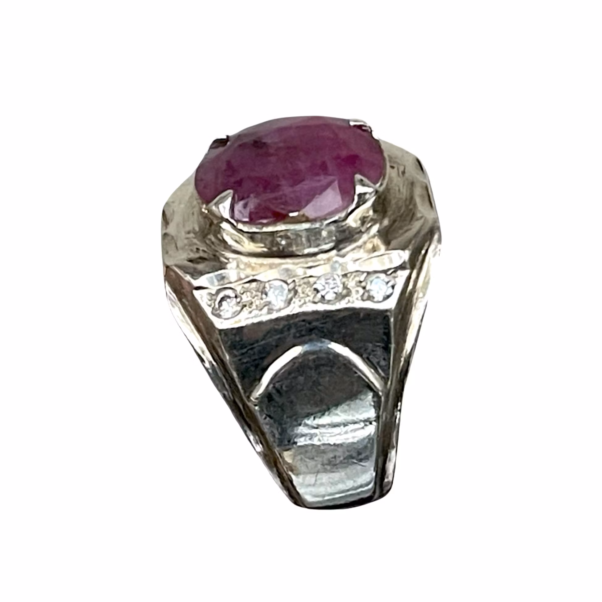 Elegant och gedigen vintage ring i sterling silver. Ringen är prydd med en stor, oval, fasettslipad rubin i djup röd till purpurröd ton. Stenen uppvisar naturliga inneslutningar, vilket är normalt för äkta rubiner. På sidorna sitter små klara accentstenar.