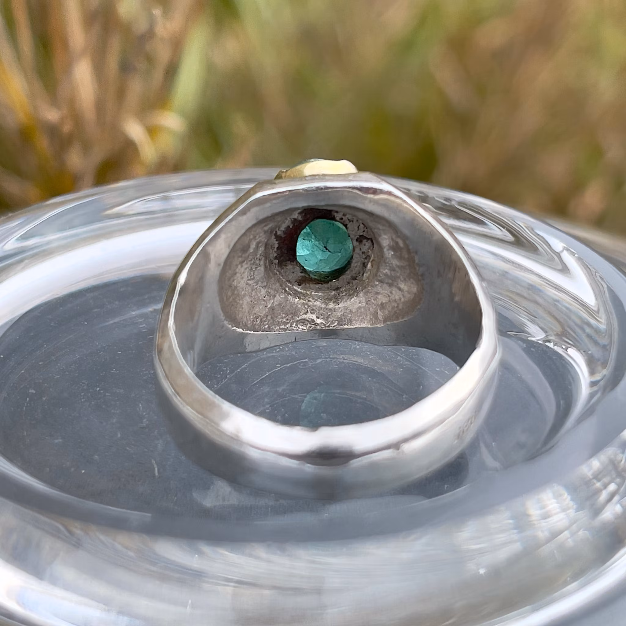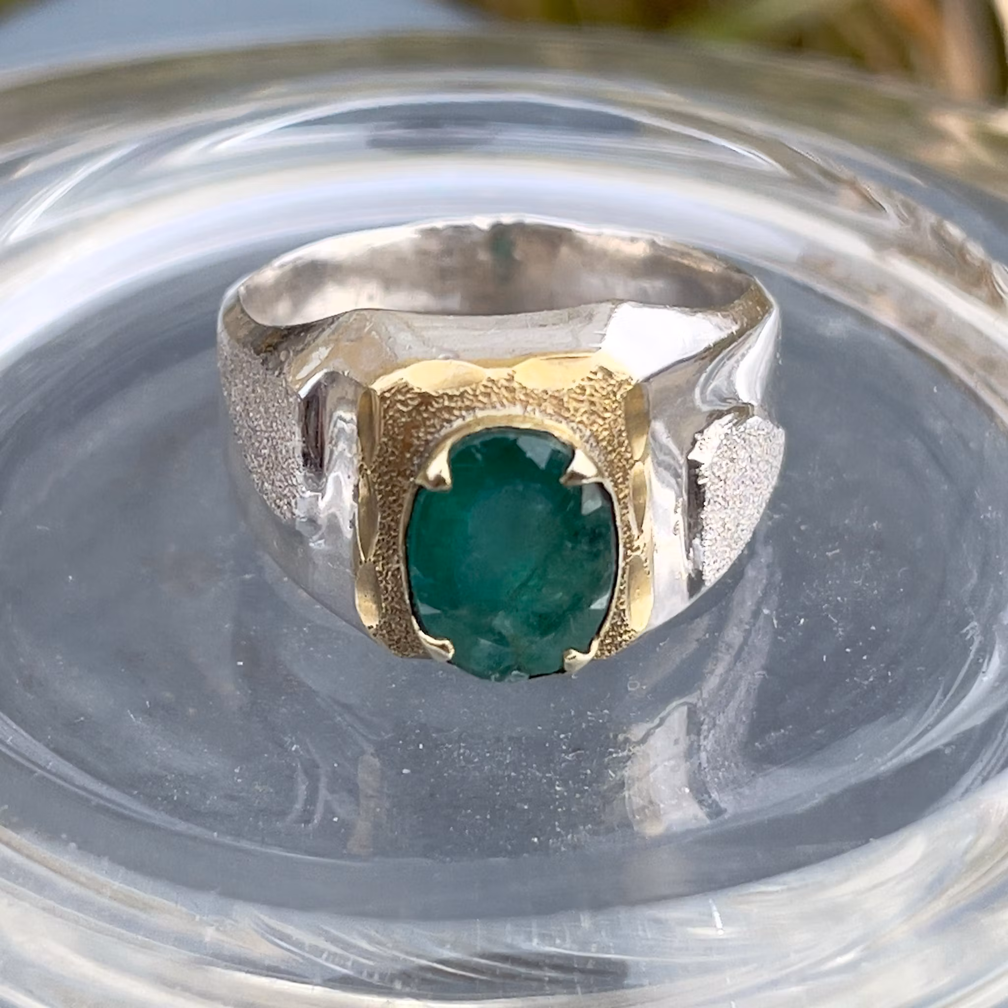 Elegant och kraftig vintage ring i sterling silver (925) med en vacker grön smaragd i centrum. Ringen har en klassisk signetrings design med guld färgad infattning runt stenen som ger en exklusiv kontrast mellan silver och guldton.