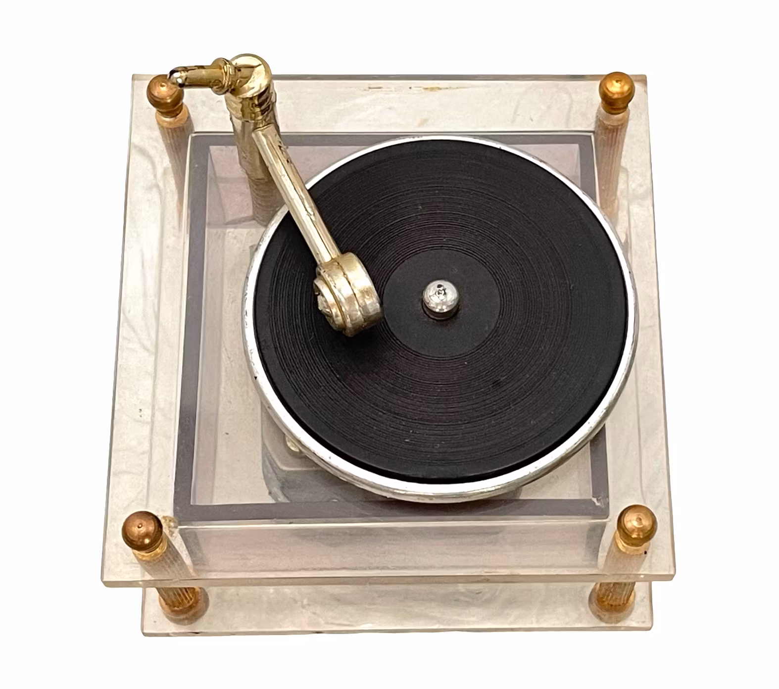 Vintage Speldosa – Miniatyr Grammofon i Plexiglas och Mässing, Fidelent, Japan